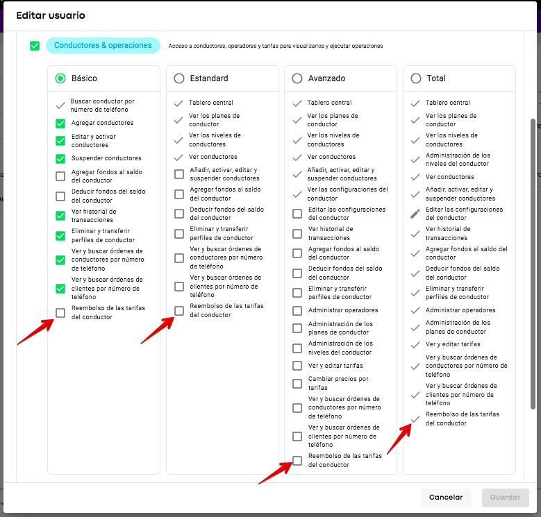 El acceso para gestionar reembolsos de tarifas a los conductores es predeterminado para los usuarios con nivel de acceso Completo y acceso Completo en los roles de Conductores y Operaciones. Para usuarios con acceso Básico, Estándar y Avanzado con el rol de Conductores y Operaciones, el permiso es opcional. Uno tiene que habilitar la casilla "Reembolso de las tarifas del conductor" para dichos usuarios. Las casillas "Ver y buscar órdenes de conductores por número de teléfono" y "Ver y buscar órdenes de clientes por número de teléfono" para usuarios con acceso Básico, Estándar y Avanzado con el rol de Conductores y Operaciones también deben estar activadas; de lo contrario, dichos managers no tendrán acceso a la pestaña Historial de pedidos.