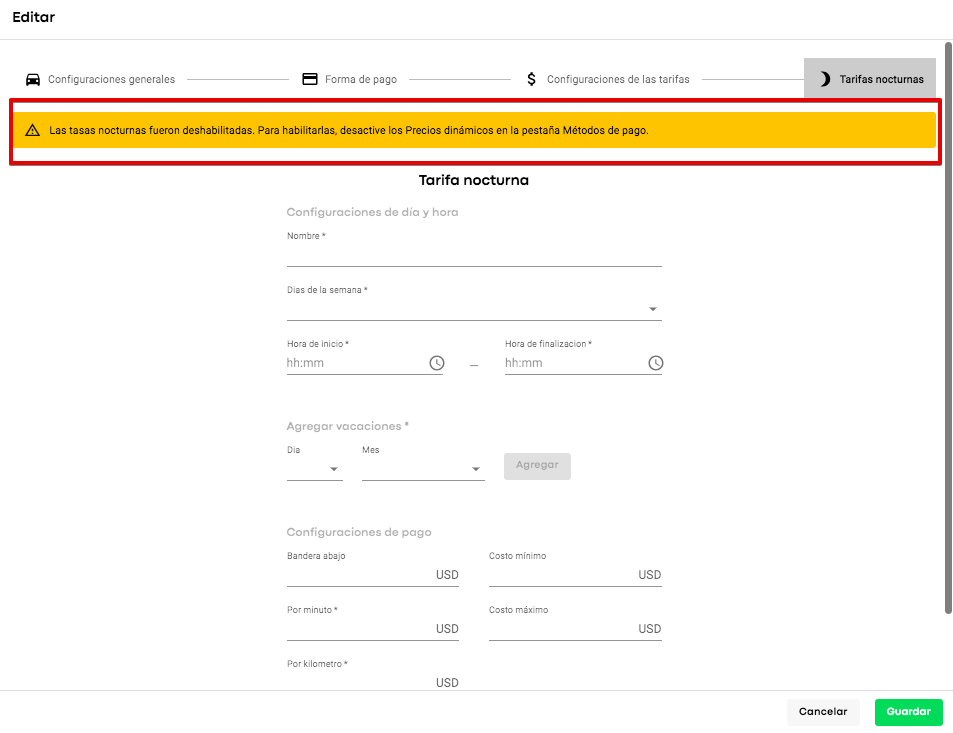 Accede a la pestaña Servicios en My Hub de Onde > abre la Servicio para la cual deseas activar las tarifas dinámicas > encuentra la opción de tarifas dinámicas y cambia la opción. Después de eso, especifica el multiplicador máximo que deseas aplicar en períodos de alta demanda. El valor máximo predeterminado del multiplicador es 5.0, el mínimo es 1.0.