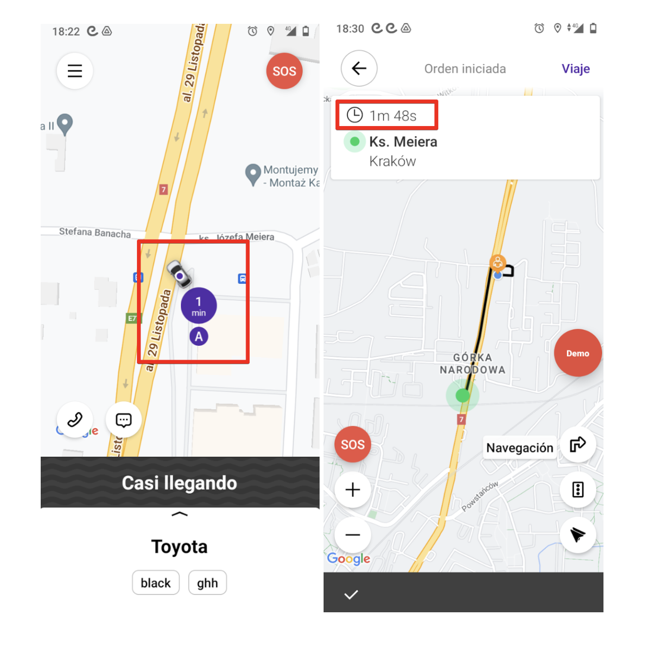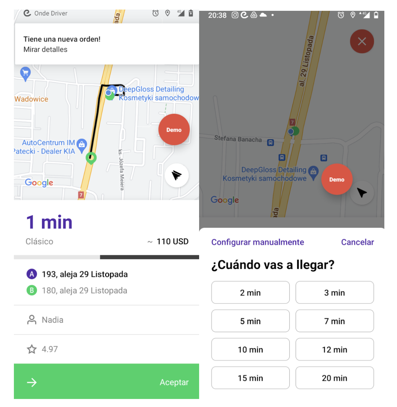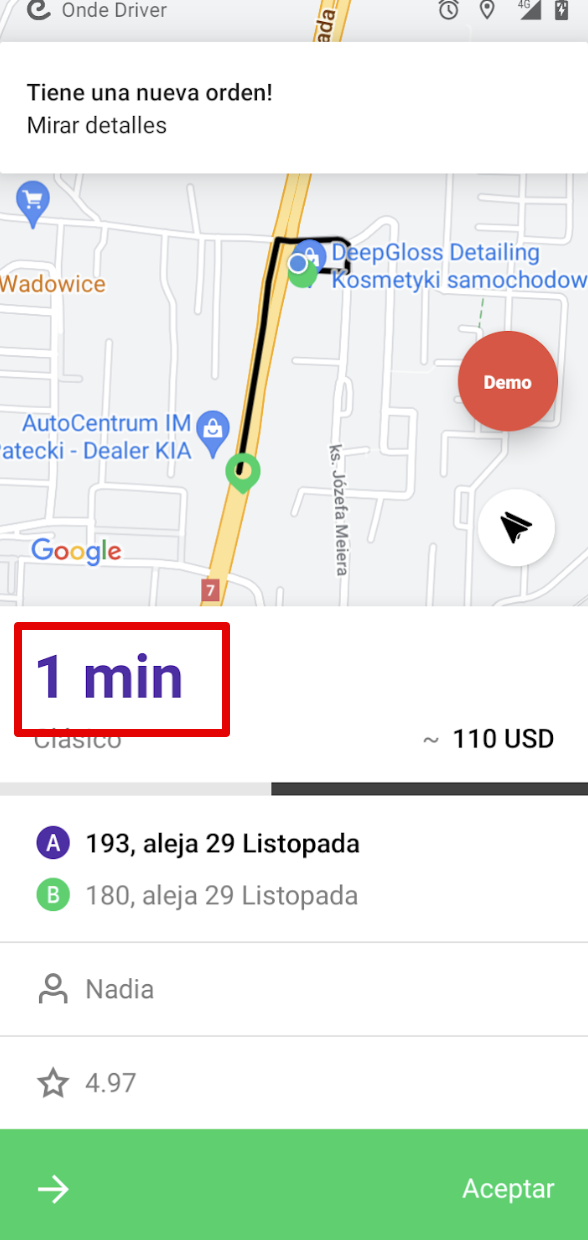 Cuando el pedido es "Aceptado", tanto el cliente como el conductor pueden realizar un seguimiento de la hora de llegada en sus aplicaciones.