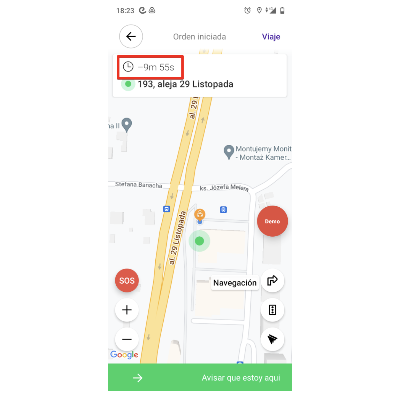 A medida que el conductor se acerca a la recogida, la aplicación del Cliente mostrará los minutos restantes y la aplicación del Conductor, la cuenta regresiva desde el tiempo estimado de llegada original. La cuenta regresiva comienza en el momento en que se acepta el pedido y no depende de que el automóvil del conductor se mueva o no, por lo que el conductor debe dirigirse a la recogida al instante para cumplir con la hora estimada de llegada. Si el conductor se demora, corre el riesgo de no cumplir con la fecha límite de la hora de llegada.
