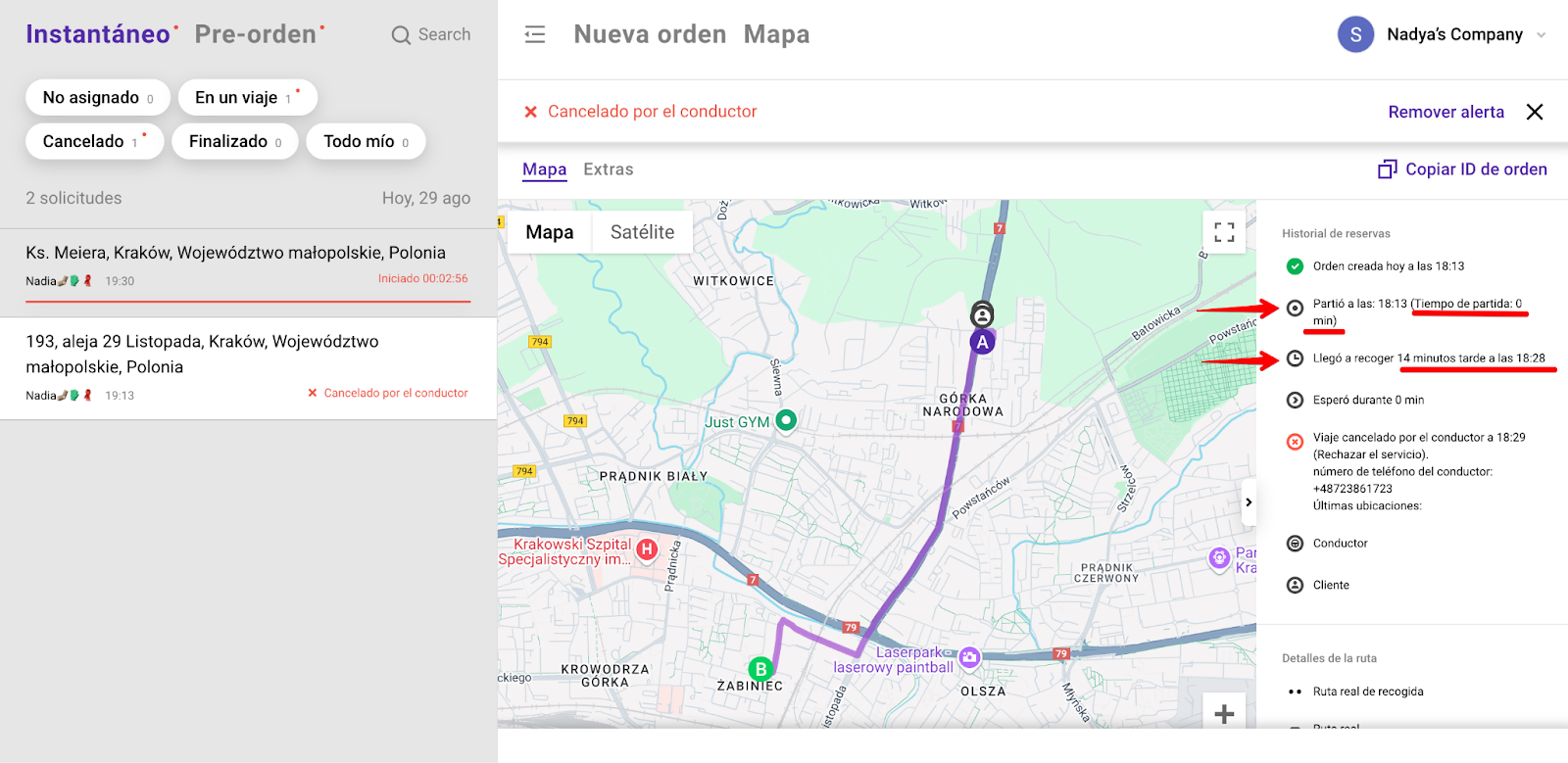 Se puede realizar un seguimiento de la hora estimada de llegada frente a los datos de llegada reales de cada orden en el "Historial de reservas" de la aplicación del Operador.