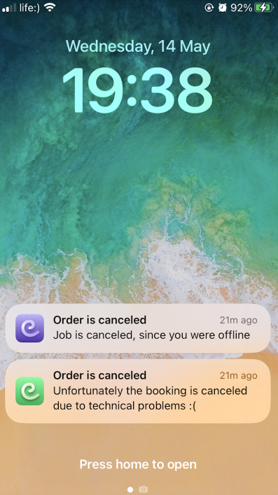 Una vez que el conductor acepta un pedido anticipado, tanto el cliente como el conductor reciben una notificación automática del sistema relevante con una breve alerta sonora. Ten en cuenta que las notificaciones de las aplicaciones deben estar permitidas en el dispositivo