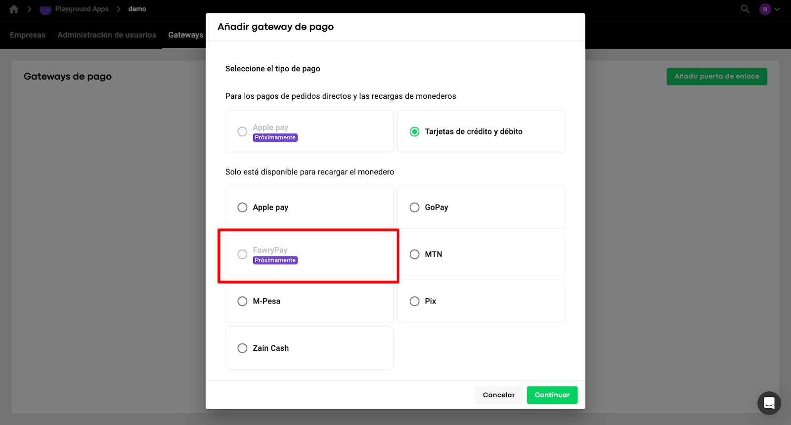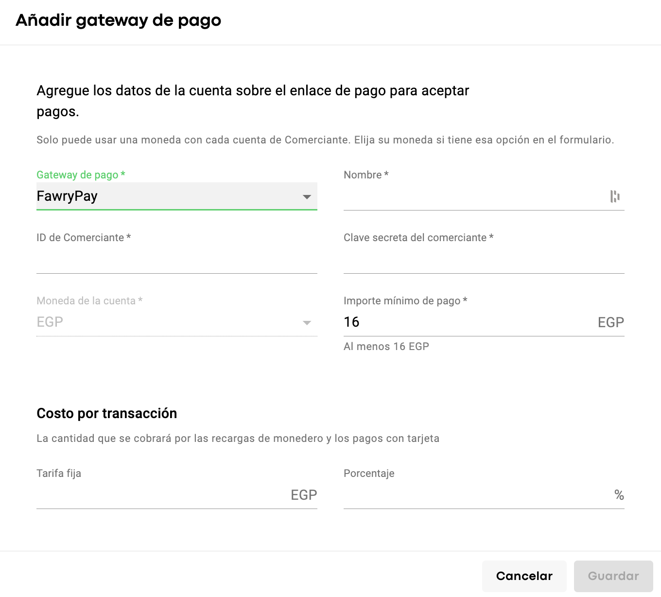Para habilitar el método de pago Fawry en las recargas de Cartera, tu empresa debe:
