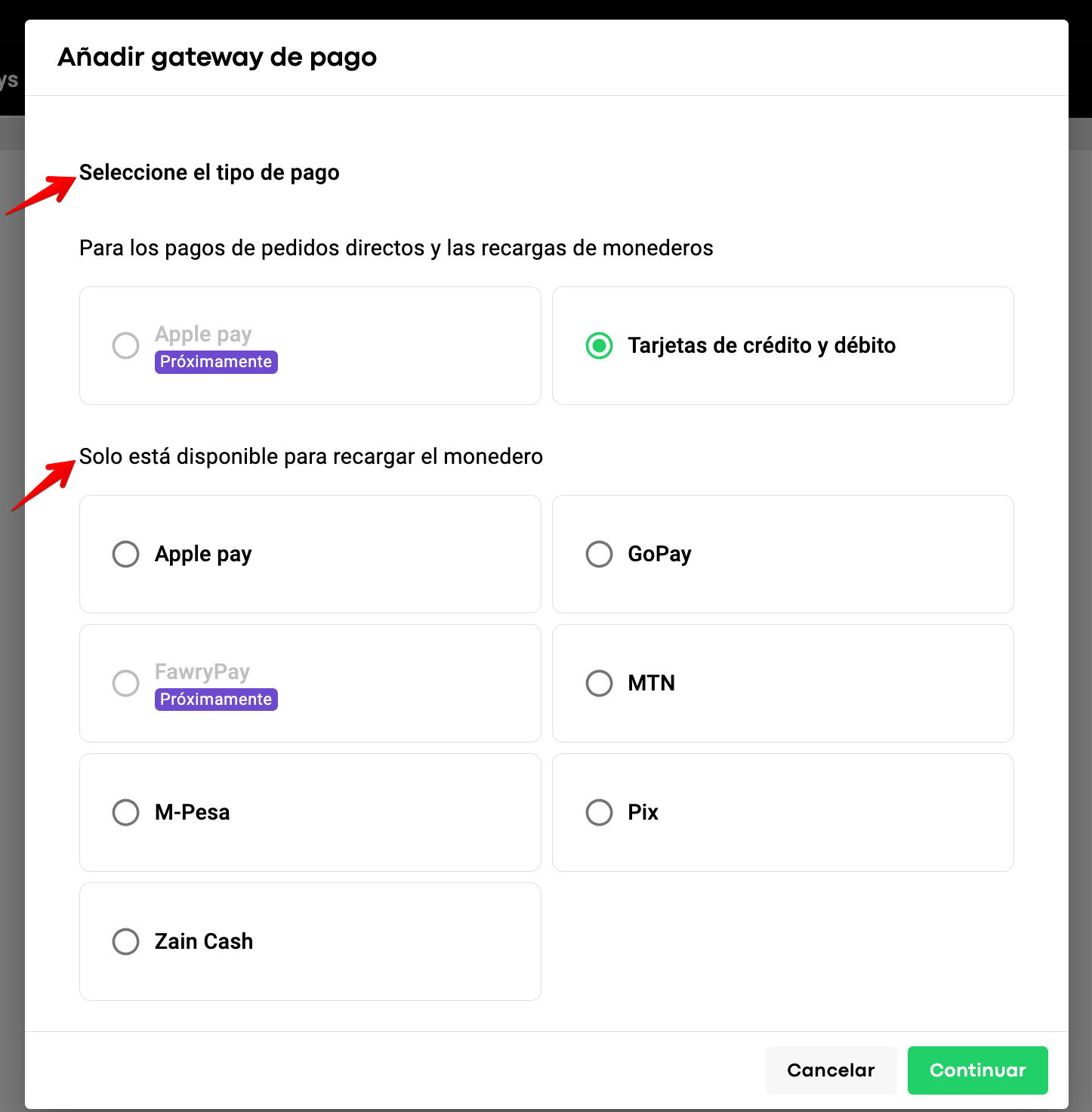 Para ello, la empresa debe añadir 2 registros de pago separados en comerciante uno por uno y activarlos en My Hub.
