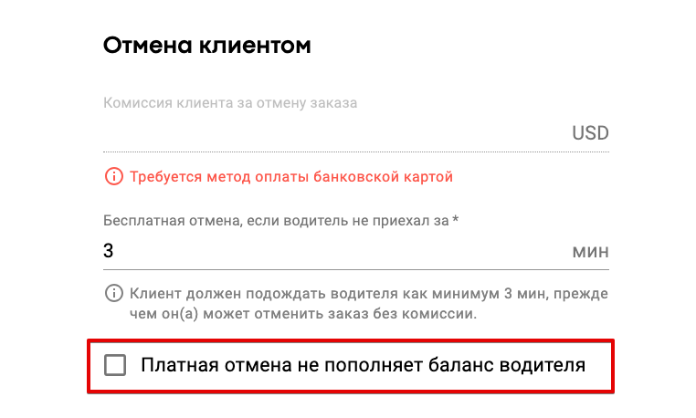 Если поставить галочку в поле "Платная отмена не пополняет баланс водителя", комиссия за отмену заказа поступит на счет компании.