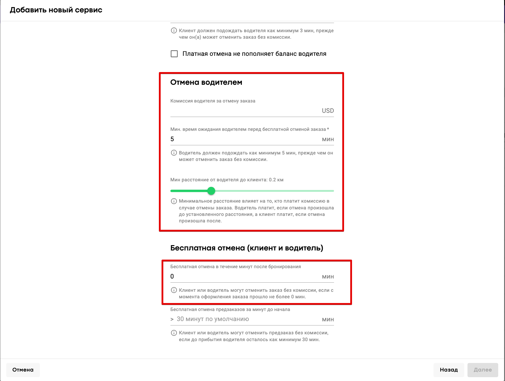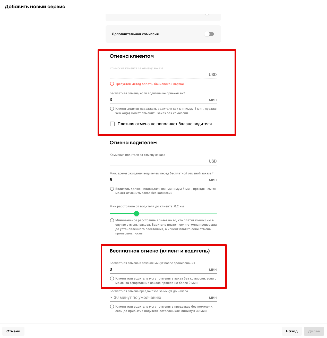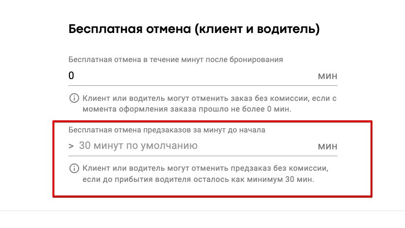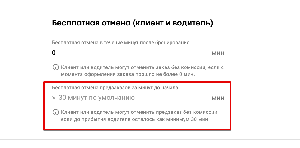 1. Для отмен предзаказов, которые уже приняты водителем, существует "бесплатная отмена", которая указывается в поле "Бесплатная отмена предзаказов за минут до начала". По умолчанию установлено 30 минут. Следовательно, обычно комиссия за отмену взимается с клиента, если он отменяет предзаказ, который уже принят водителем, менее чем за 30 минут до начала предзаказа.