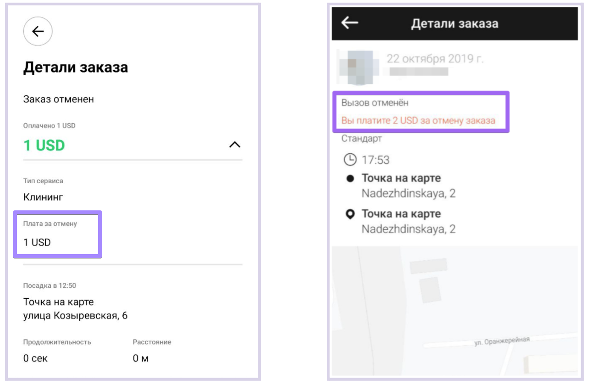 приложение всегда ставит пользователя в известность о комиссии за отмену заказа, если были нарушены условия, перечисленные выше в статье