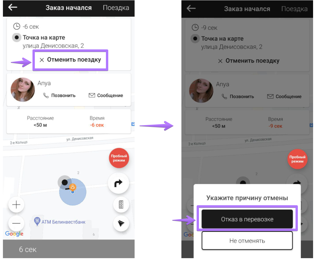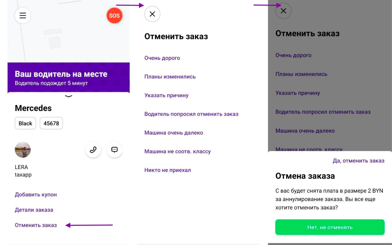 Пошаговый процесс отмены заказа позволяет свести к минимуму количество ошибочно отмененных поездок: