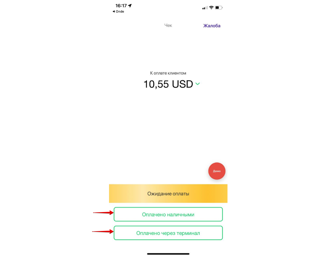 При оплате наличными или через терминал клиент передает деньги напрямую водителю или переводит средства при помощи терминала в авто. Водитель при этом должен подтвердить оплату в приложении, нажав на кнопку “Оплачено наличными” или “Оплачено через терминал”.
