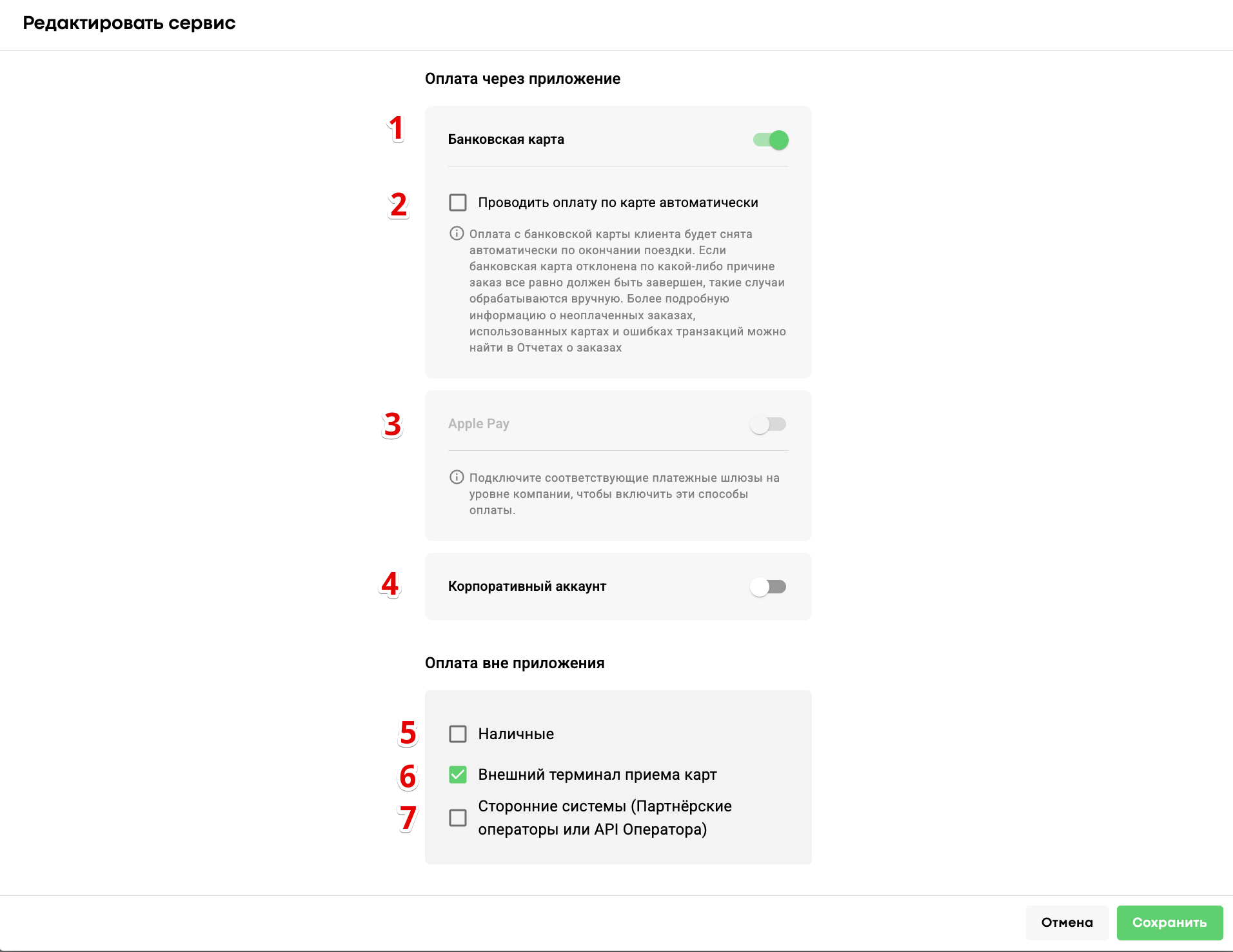 Способ оплаты “банковская карта” доступен для заказов, созданных в приложении клиента. Если сервис поддерживает оплату только картами, его нельзя будет заказать из приложения оператора или веб-приложения.