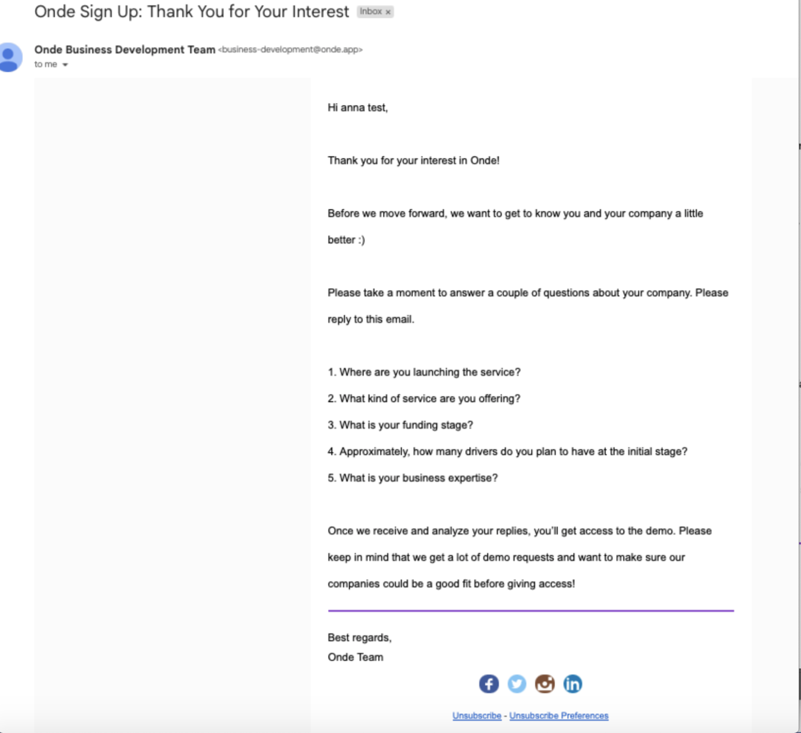 Ответьте на вопросы из полученного письма. Как только мы получим ответы на вопросы, ваш личный менеджер по развитию бизнеса свяжется с вами и предоставит ссылку для регистрации тестового аккаунта.
