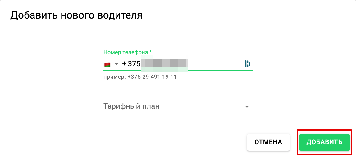2. Введите номер телефона водителя. Кроме того, Вы можете задать тарифный план, на котором водитель будет работать. После этого нажмите “Добавить”.