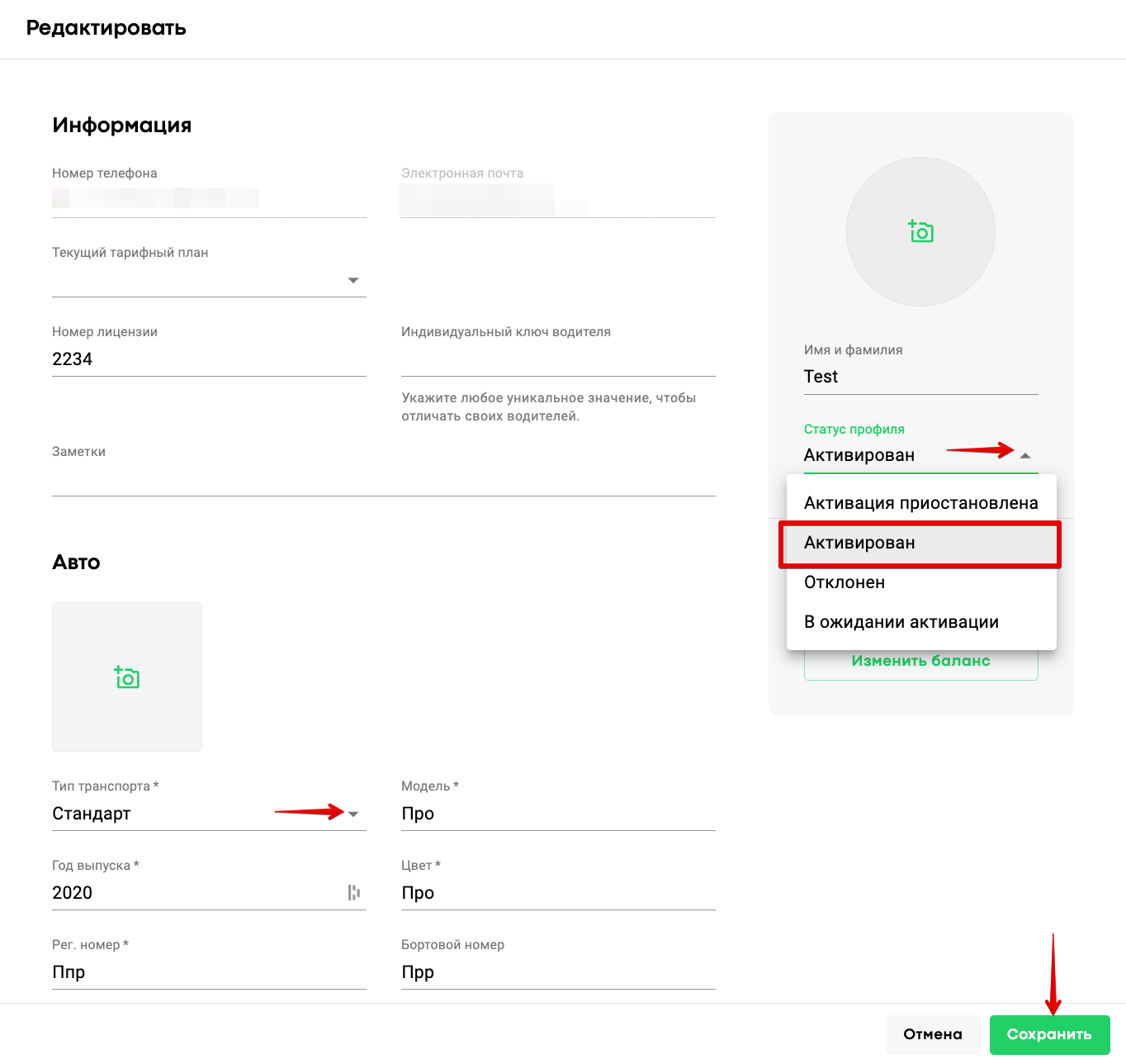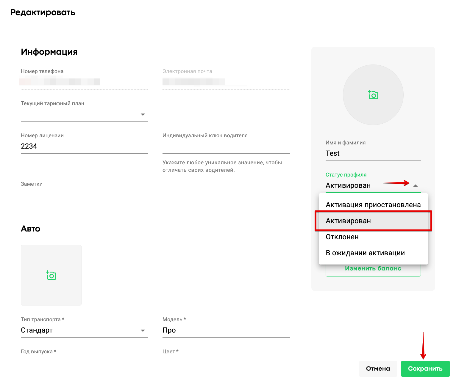 Откройте профиль водителя и просмотрите заполненную информацию. Проверьте, не пропущены ли обязательные для заполнения поля (эти поля отмечены значком *). Задайте водителю тип транспорта, измените статус с "В ожидании активации" на "Активирован" и нажмите на кнопку «Активировать».