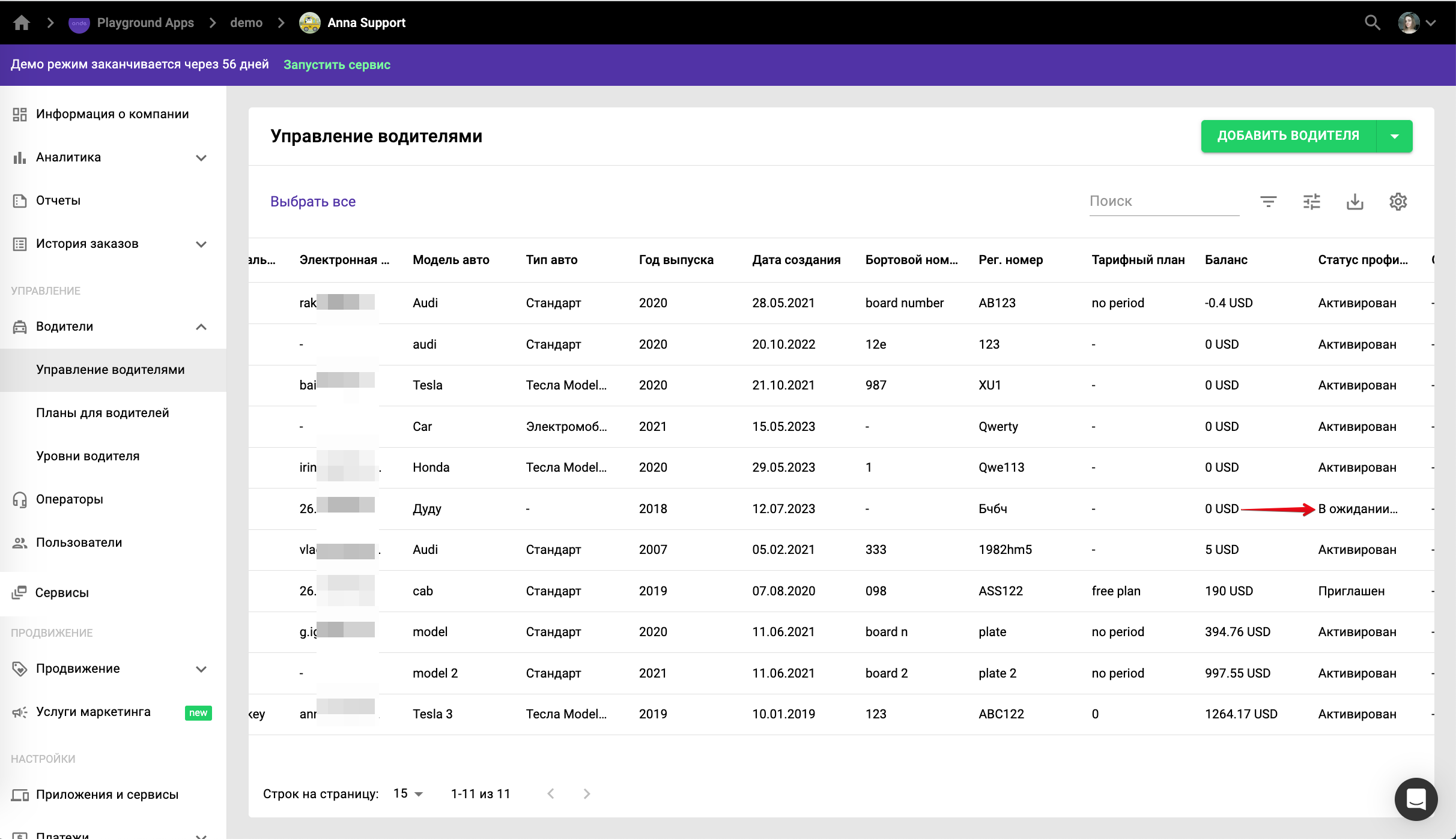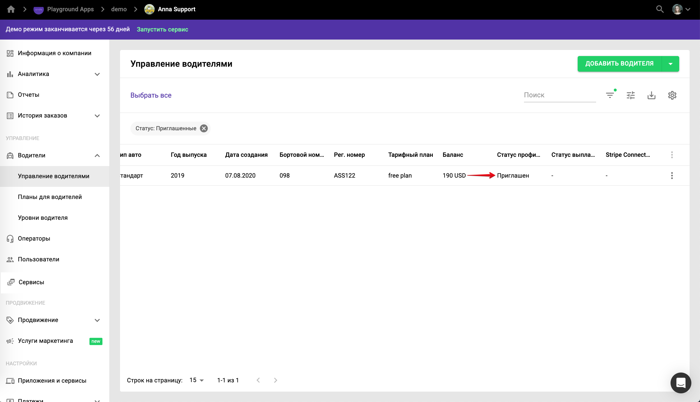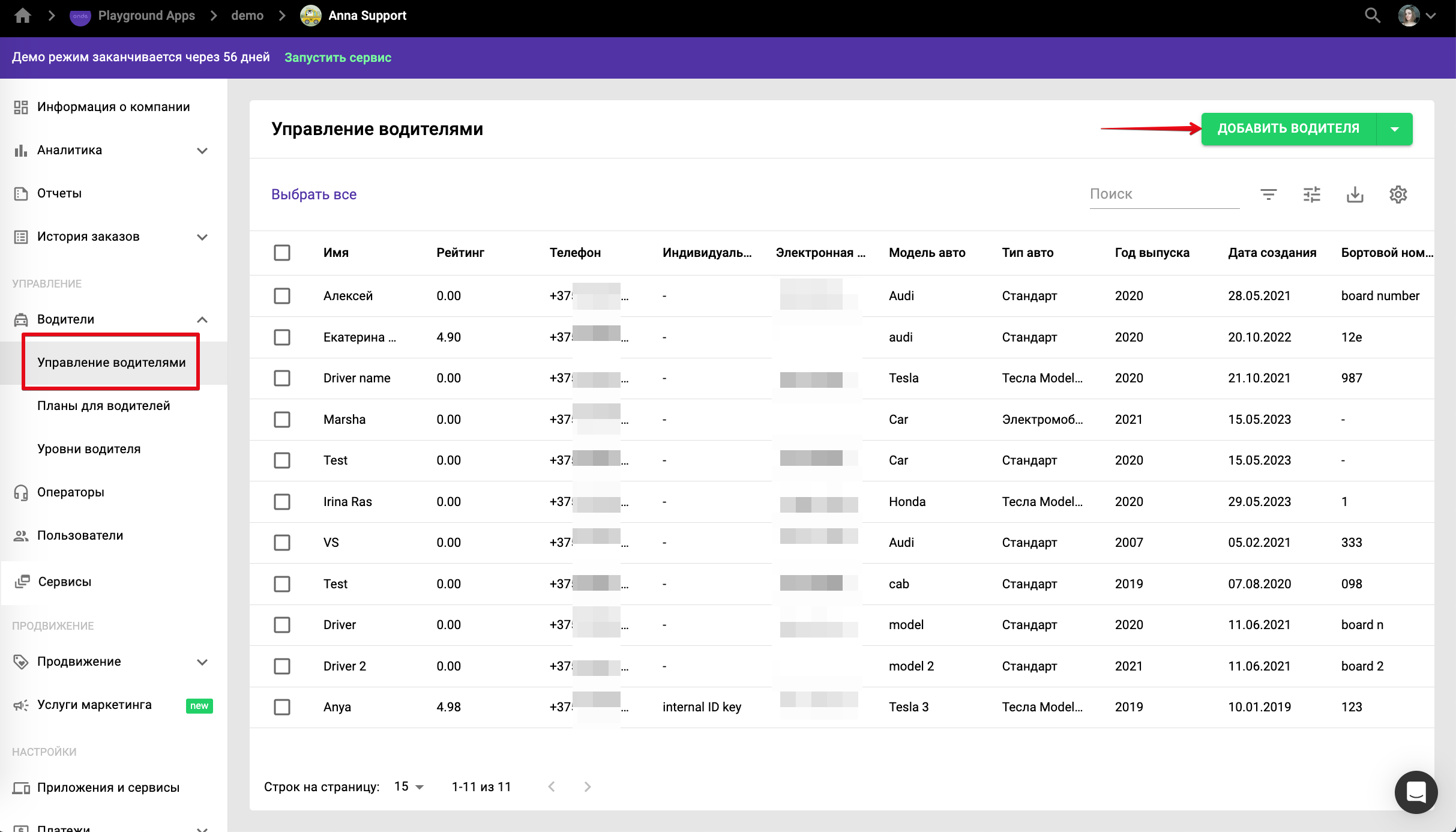 Владелец компании может добавлять или удалять водителей в разделе «Водители» >> «Управление водителями».