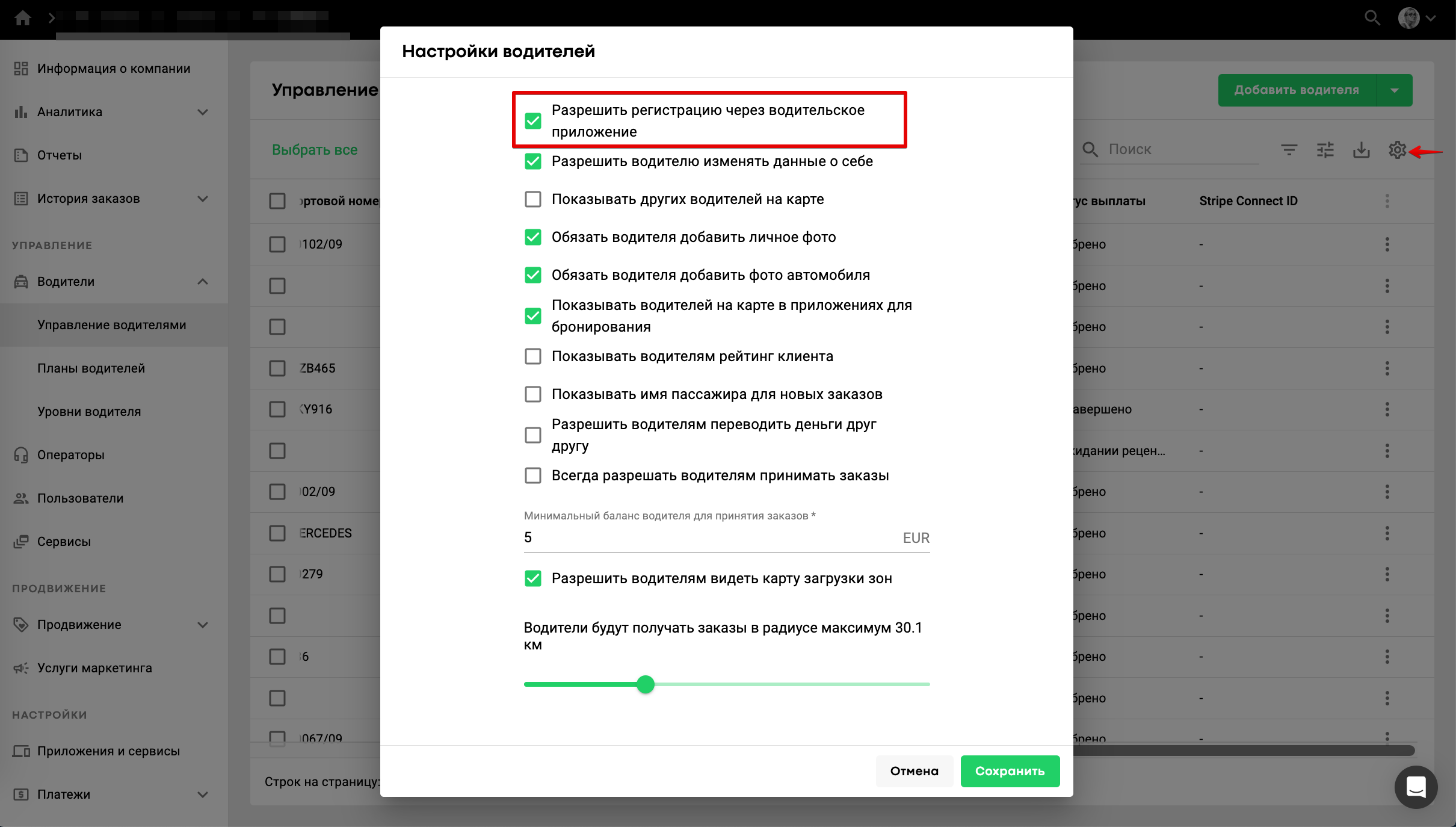 Важно: Вы также можете разрешить водителям регистрацию через приложение. Для этого зайдите в «Настройки водителей» и выберите нужную опцию из списка.