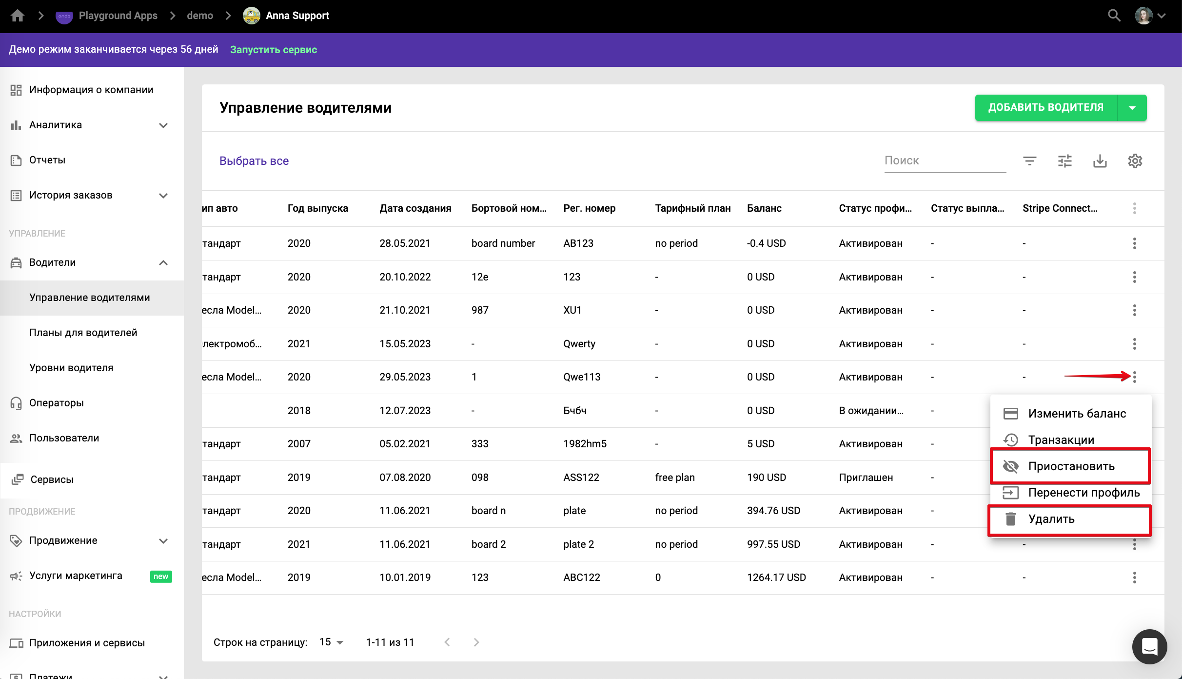 Обратите внимание, что удаление водителя - необратимое действие. Удалить водителя можно независимо от того, в каком статусе он находится и какой баланс имеет.