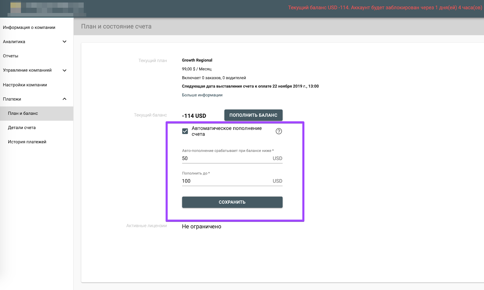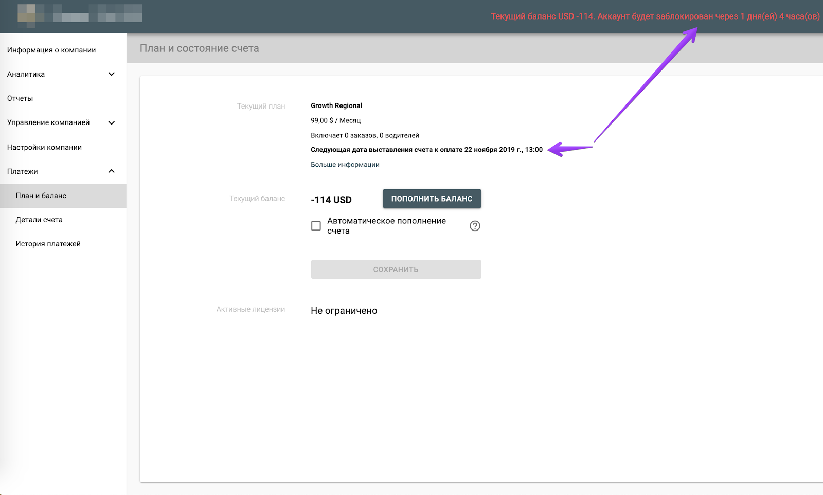 На скриншоте показана ситуация, при которой аккаунт будет заблокирован через 1 день 4 часа, хотя до следующей даты выставления счета еще далеко.