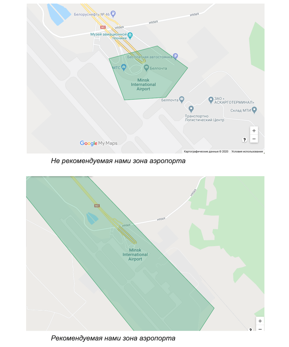Перед тем, как рисовать конкретные территории, советуем ознакомиться с маркерами карты Google. Например, если ввести “Международный аэропорт Минск”, маркер окажется посреди взлетно-посадочной полосы. Таким образом, если взлетно-посадочные полосы аэропорта не включены в зону “Аэропорт” и клиенты выбирают “Международный аэропорт Минск” в качестве места посадки/высадки, стоимость поездки будет рассчитываться по таксометру. Мы рекомендуем делать зоны немного больше, включая в них прилегающие территории.