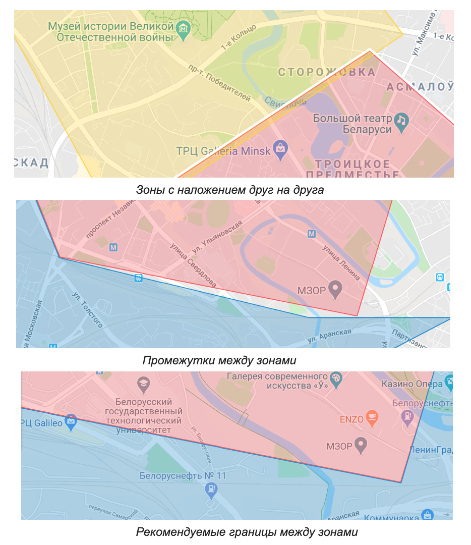 При создании зон очень важно не допускать наложения одной зоны на другую и не оставлять большие пропуски между ними. На конкретной территории приоритет отдается тарифу только одной зоны, поэтому наложение одной зоны на другую не имеет смысла. Промежутки между зонами лучше оставлять минимальные. Это поможет избежать ситуаций, когда клиент делает заказ из такого промежутка между зонами и стоимость поездки рассчитывается по таксометру.