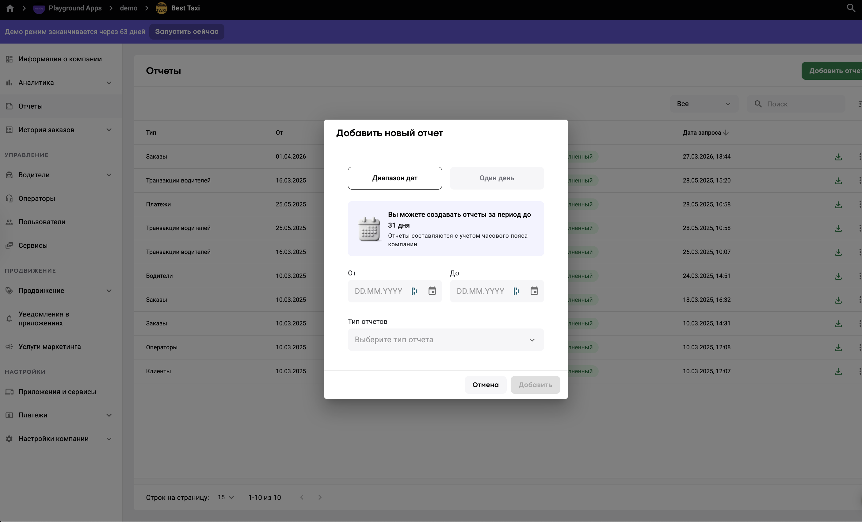 Ознакомиться с терминологией отчетов можно в наших статьях Отчет по заказам, Отчет по клиентам, Отчет по водителям, Отчет по операторам, Отчет по платежам, Отчет о транзакциях водителей.