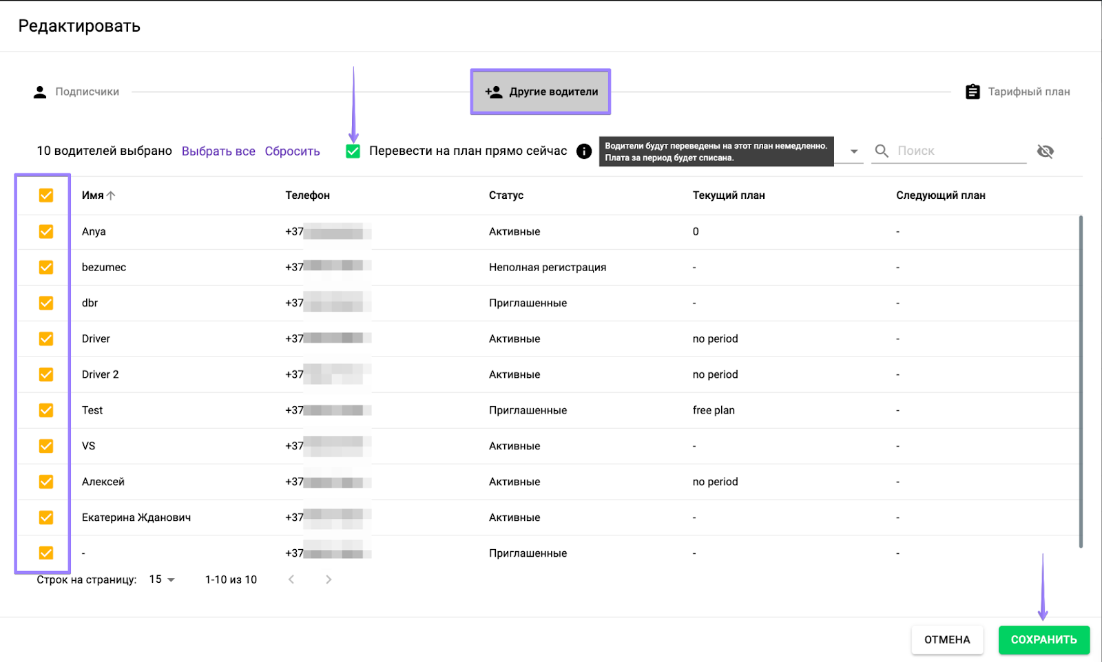 Если необходимо перевести водителя на новый план сразу же, откройте тарифный план, перейдите во вкладку “Другие водители”, отметьте нужного водителя, поставьте галочку в поле “Перевести на план прямо сейчас” и нажмите “Сохранить”.