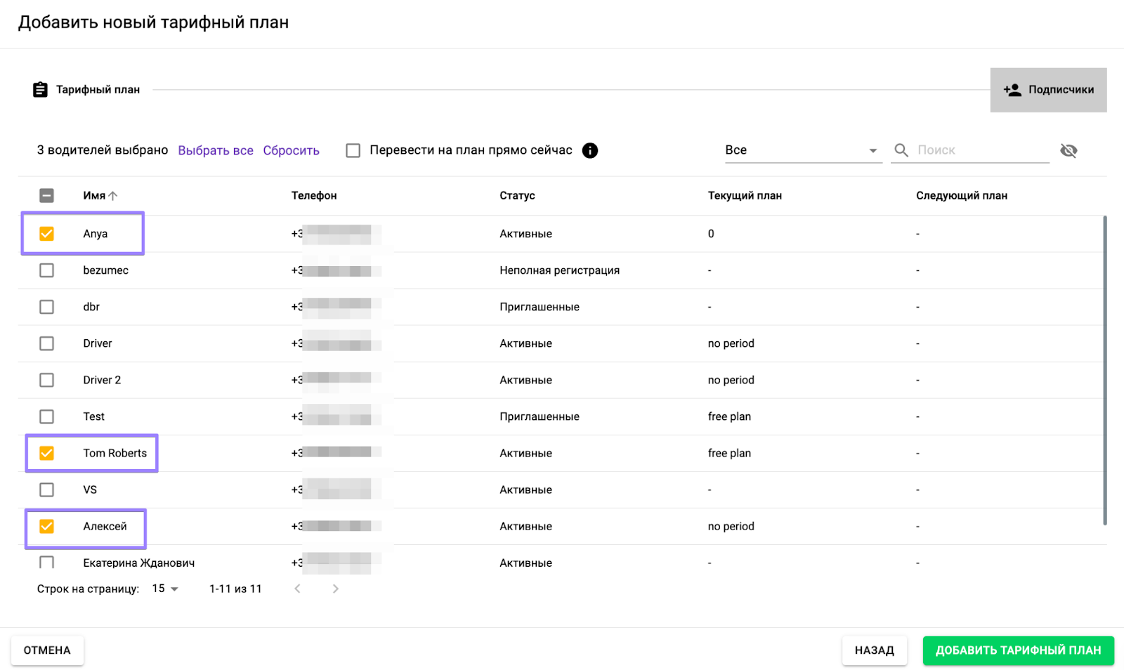 После того как вы создали тарифный план, нажмите “Далее”, выберите водителей, которые будут на нем работать, и нажмите “Добавить тарифный план”.