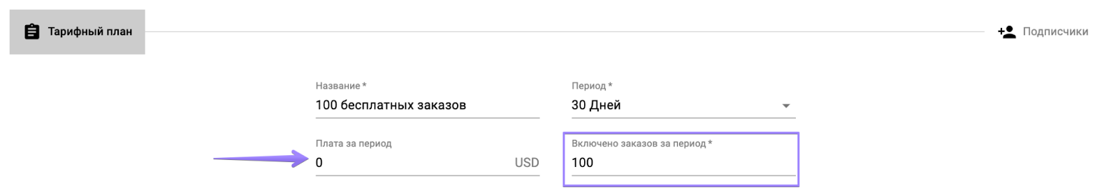 Давайте создадим тарифный план с периодическими платежами раз в месяц. Укажите плату за период, например, $50, и количество включенных в период заказов - 100. При таких настройках в начале каждого 30-дневного цикла с баланса водителя будет списано $50. Водитель может выполнить 100 заказов, покрытых этим периодическим платежом.