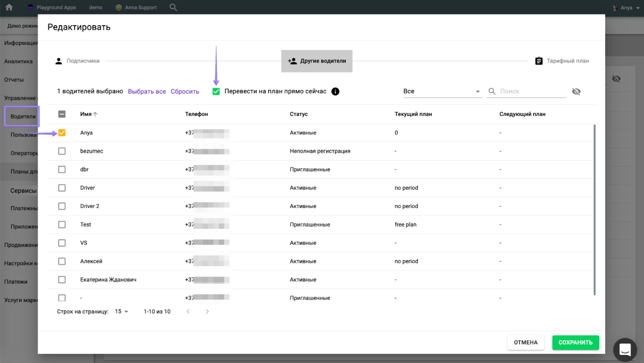Откройте нужный план, перейдите во вкладку “Другие водители”, поставьте галочку в поле “Имя”, чтобы выбрать всех водителей, поставьте галочку в поле “Перевести на план прямо сейчас” и нажмите “Сохранить”.
