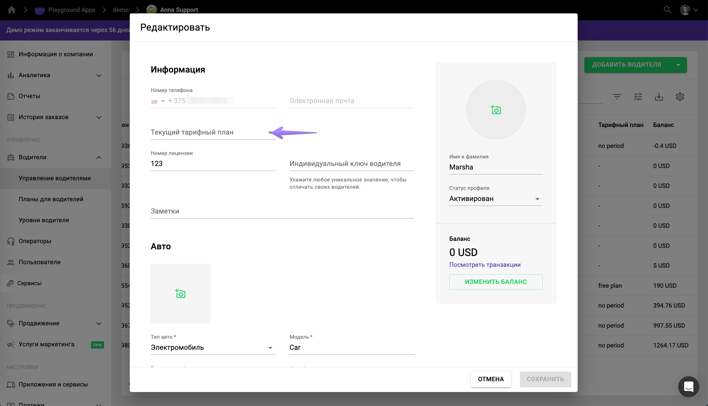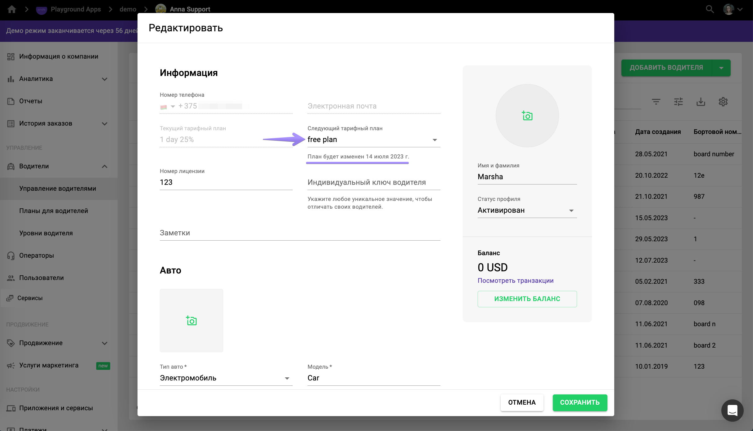 Также водителя можно подписать на тарифный план прямо в его профиле. Для этого откройте профиль водителя во вкладке “Водители”, нажмите на поле “Текущий тарифный план”, выберите в выпадающем списке нужный план и нажмите “Сохранить”.