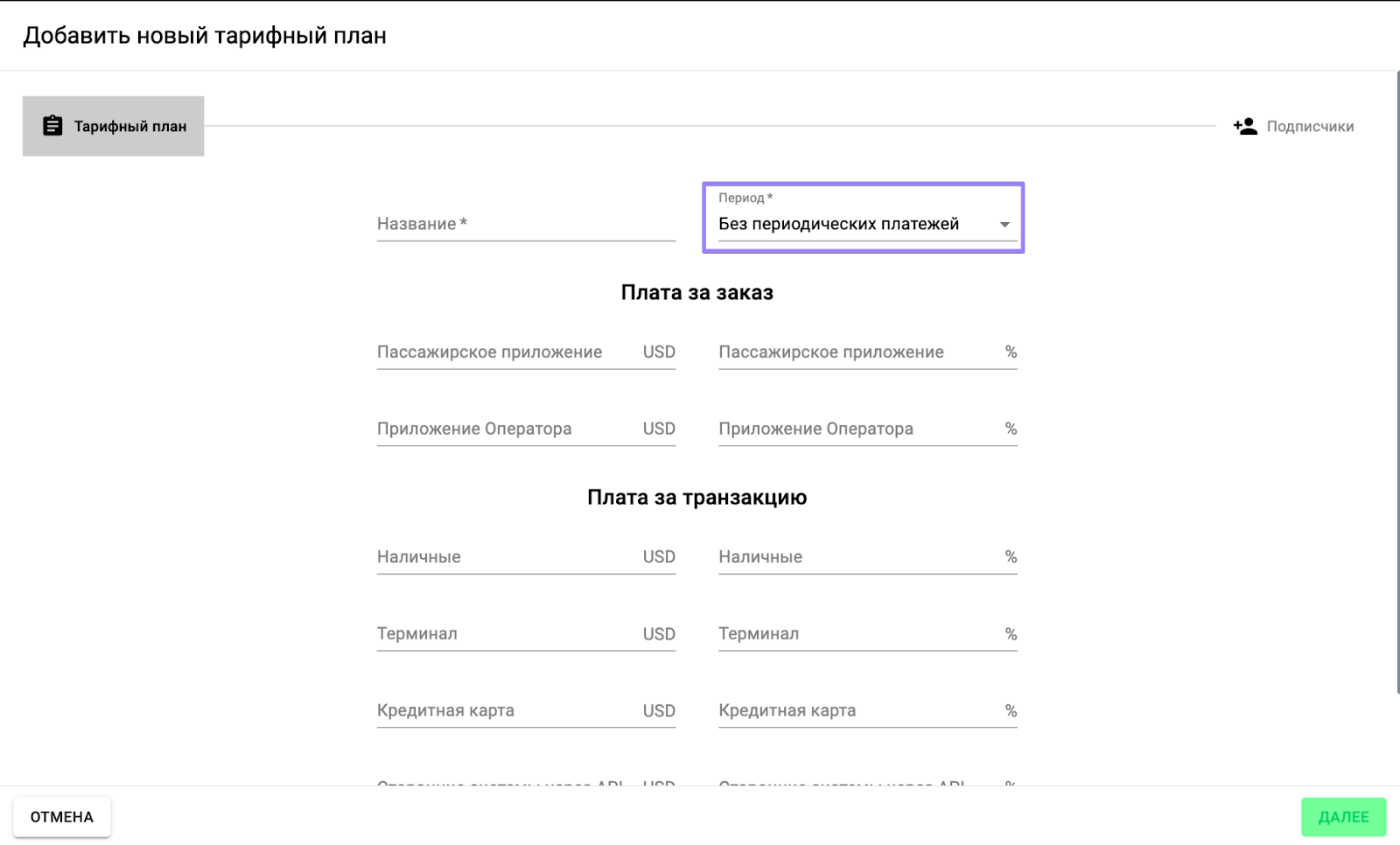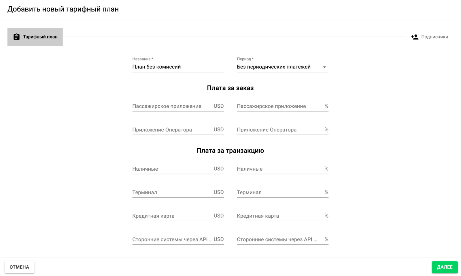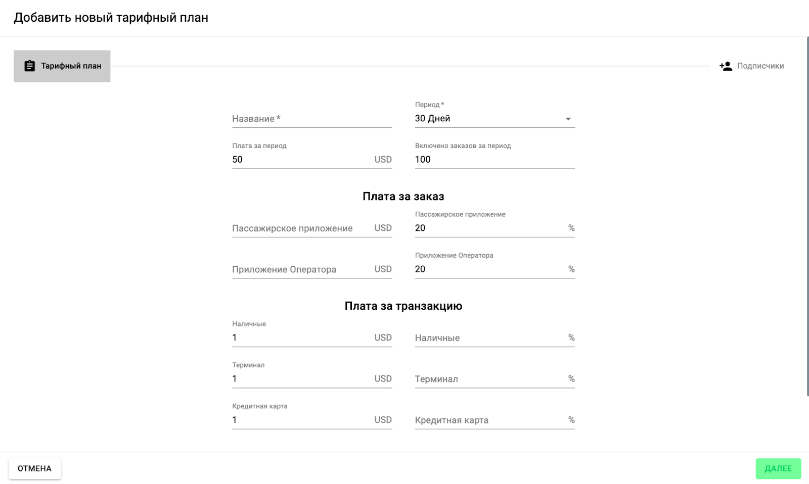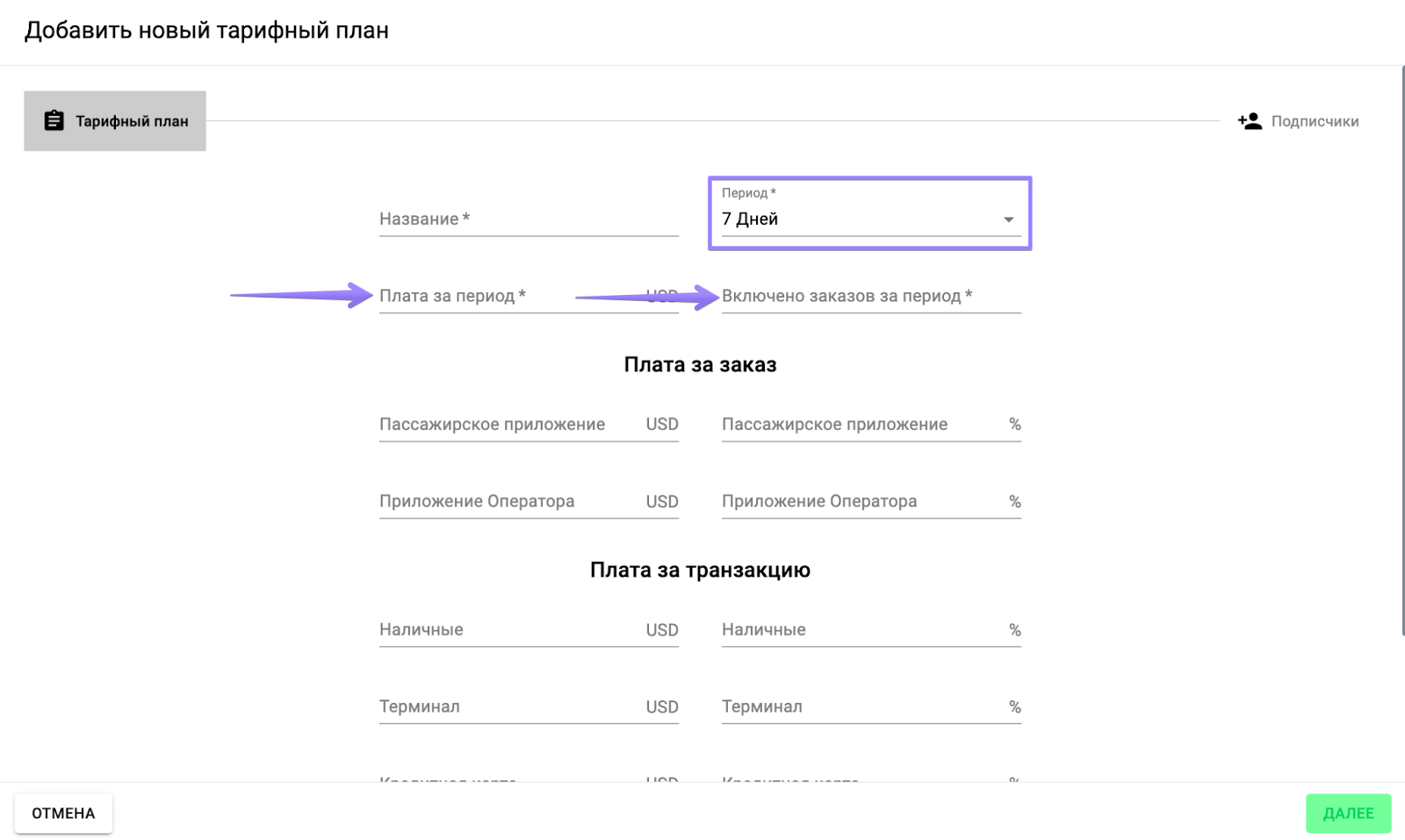 Большинство полей тарифного плана необязательны для заполнения, поэтому вы можете настроить план так, чтобы он приносил максимум выгоды и соответствовал модели вашего бизнеса. Например, вы можете разрешить водителям выполнять 100 бесплатных заказов в течение периода.