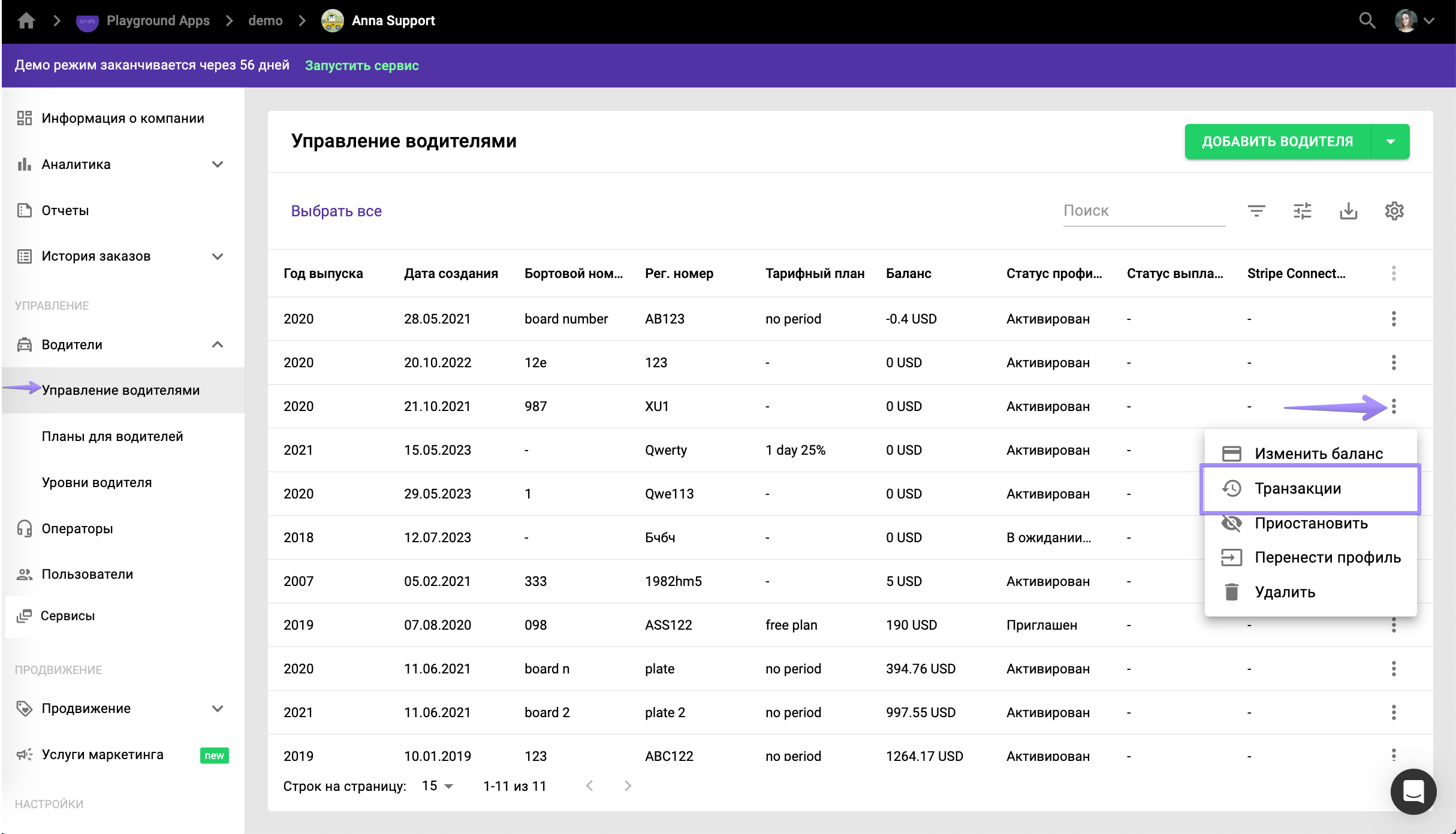 Менеджер компании может проверить все транзакции водителя в My hub > Водители > дополнительное меню > Транзакции.
