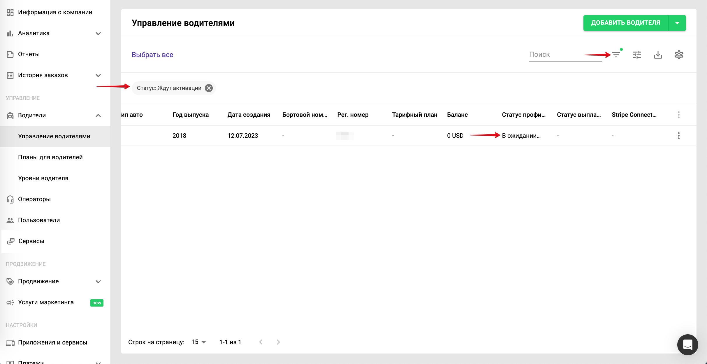 Зайдите в раздел «Управление компанией» >> «Водители» и выберите водителей со статусом «Ждут активации».