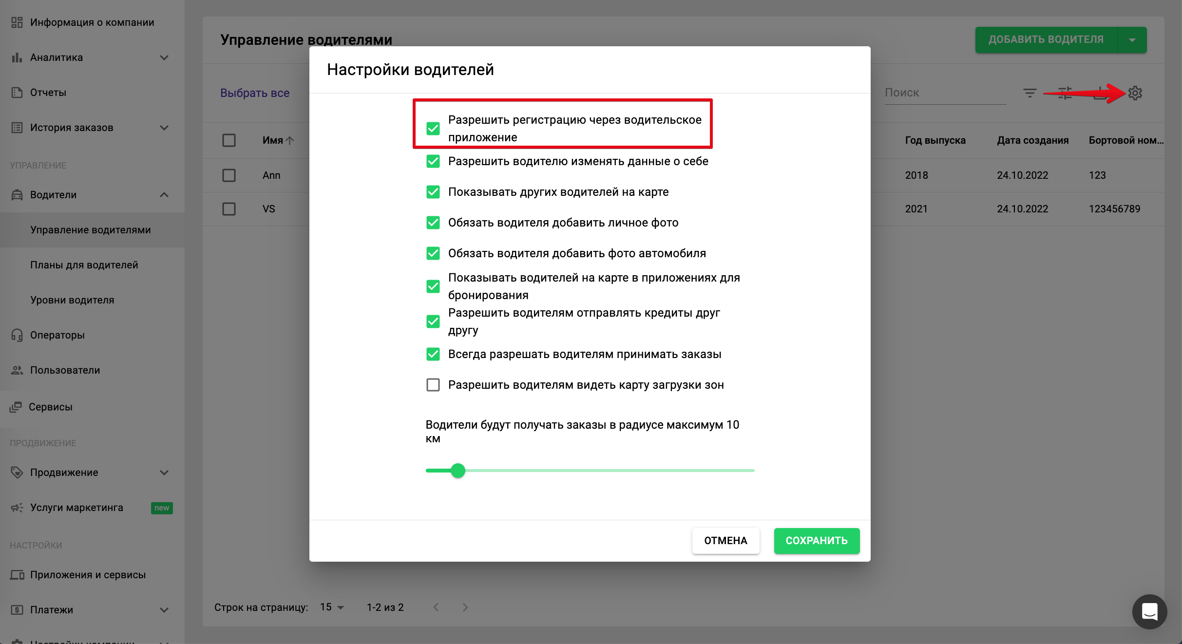 Но вы можете также позволить водителям самим регистрироваться через приложение. Для этого откройте Мой Хаб, выберите раздел «Управление компанией» >> «Водители» и нажмите на значок «Настройки водителей». В открывшемся окне выберите «Разрешить регистрацию через водительское приложение».