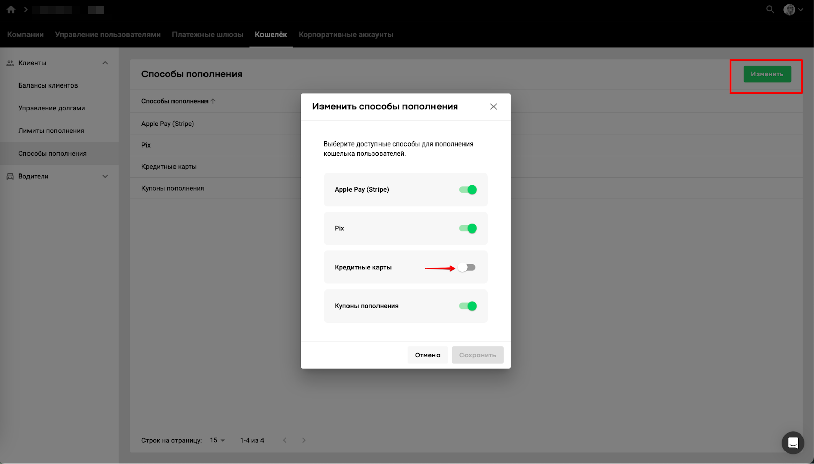 3. Чтобы отключить какой-либо способ пополнения, нажмите “Изменить” в правом верхнем углу экрана и выключите нежелательные способы пополнения.