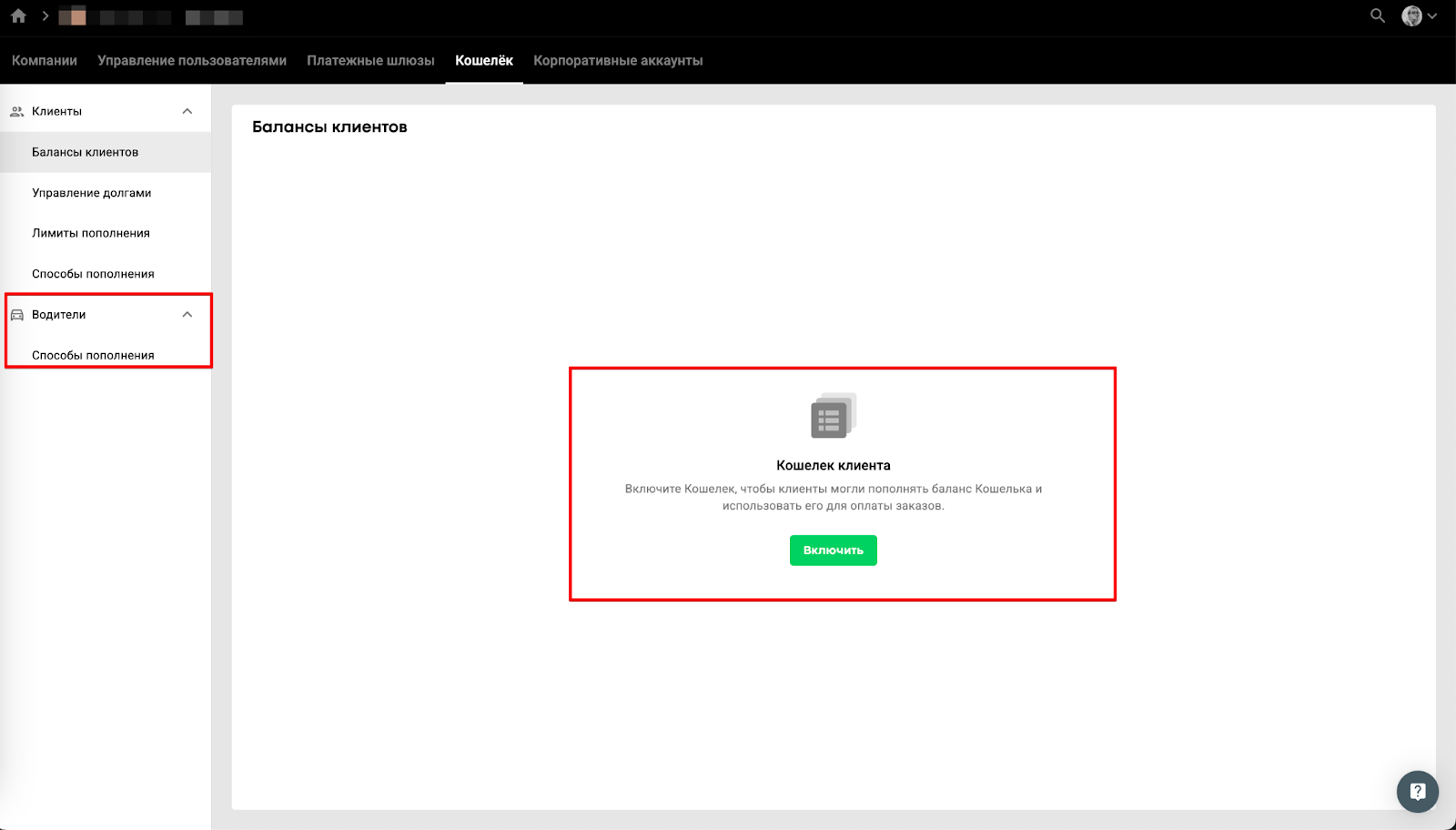 Даже если в компании не активирован кошелек клиента, в расчетном центре вы все еще можете управлять способами пополнения кошелька водителя.
