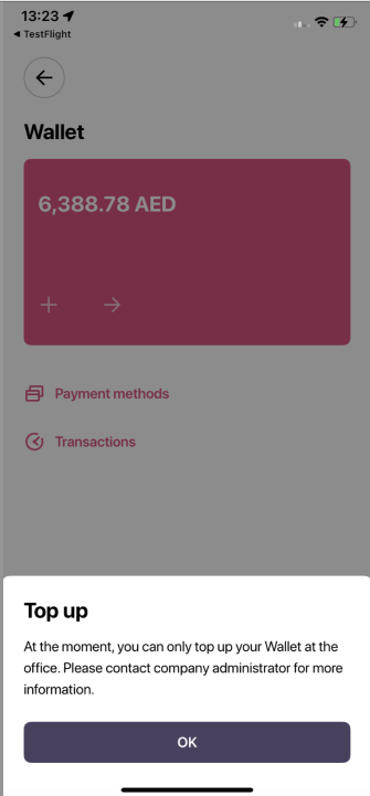 Если все способы пополнения кошелька водителя отключены, водитель будет видеть карточку кошелька, но при попытке пополнить баланс появится сообщение “На данный момент вы можете пополнить баланс только в компании. Пожалуйста, свяжитесь с администратором компании для получения более подробной информации”.