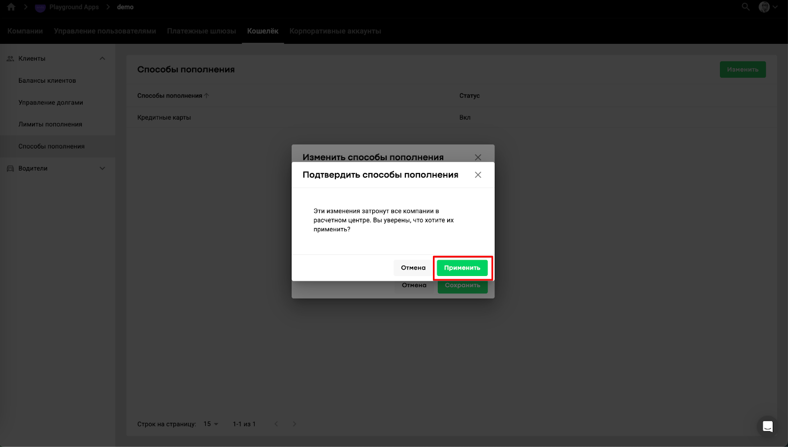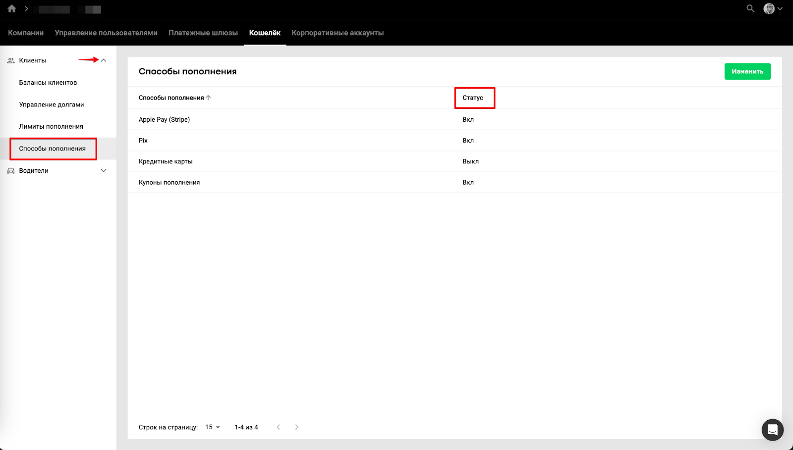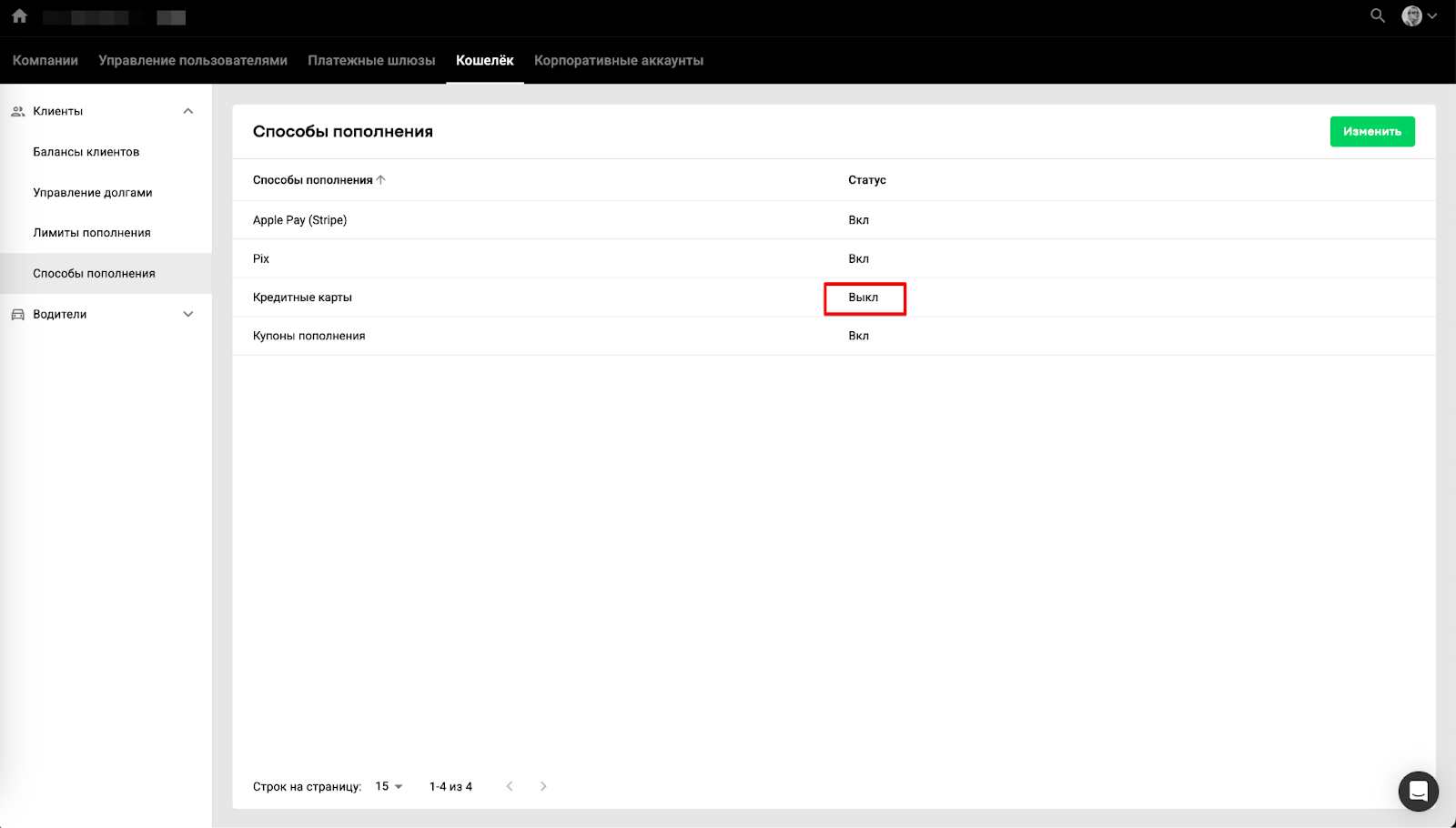 Менеджер бренда/расчетного центра может перейти в расчетный центр > Кошелек > в выпадающем списке вкладок “Клиенты” или “Водители” открыть “Способы пополнения”, чтобы управлять каждым способом оплаты отдельно для клиентов и водителей. Таким образом менеджер бренда/расчетного центра может: