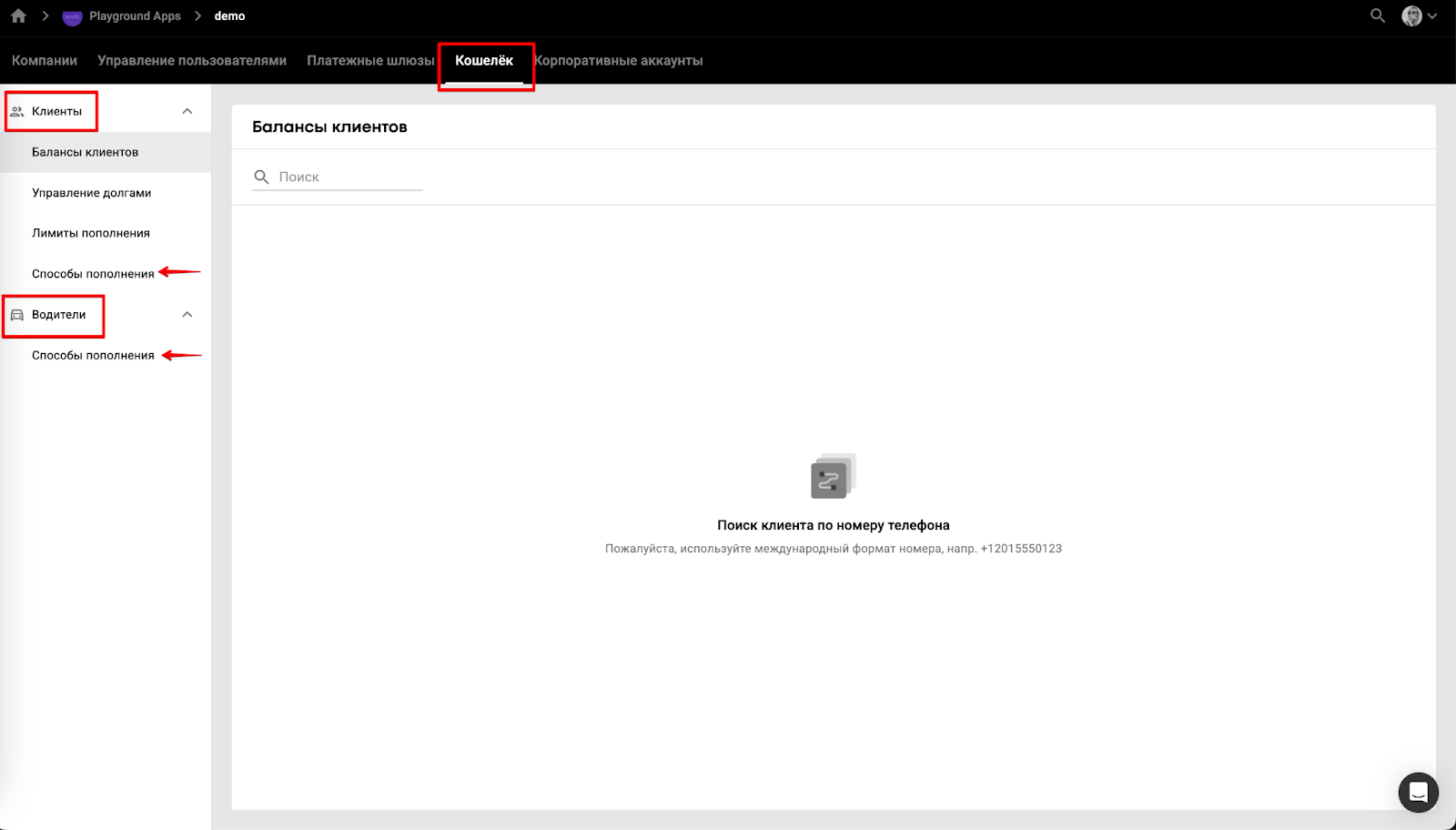 Если все способы пополнения кошелька клиента отключены, в приложении клиента не будет отображаться карточка кошелька с опцией пополнения.