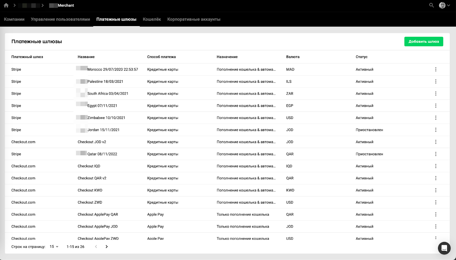 1. Откройте расчетный центр и перейдите во вкладку “Платежные шлюзы”, чтобы увидеть все добавленные способы оплаты и платежные системы.