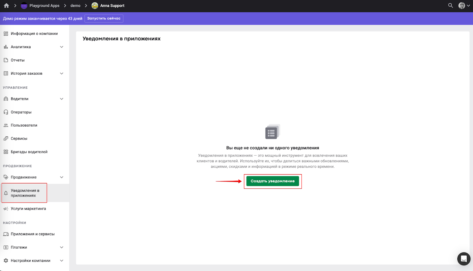 Откройте My hub > ПРОДВИЖЕНИЕ > “Уведомления в приложениях” > нажмите “Создать уведомление”.