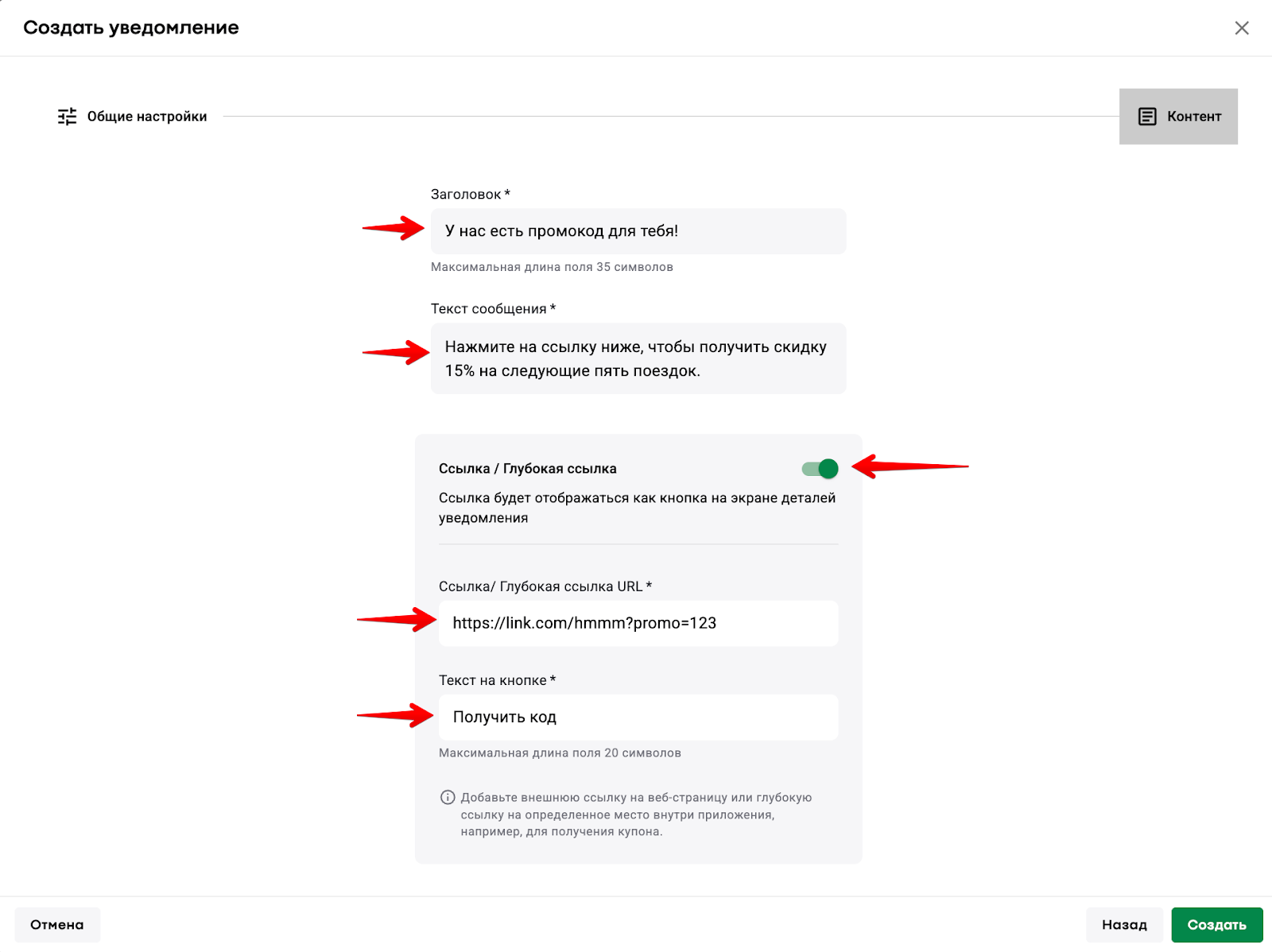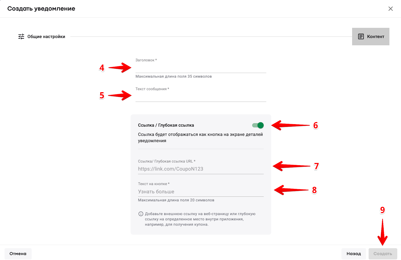 6) при необходимости включите “Ссылку/глубокую ссылку”, если хотите вместе с уведомлениями отправлять ссылки/глубокие ссылки.
