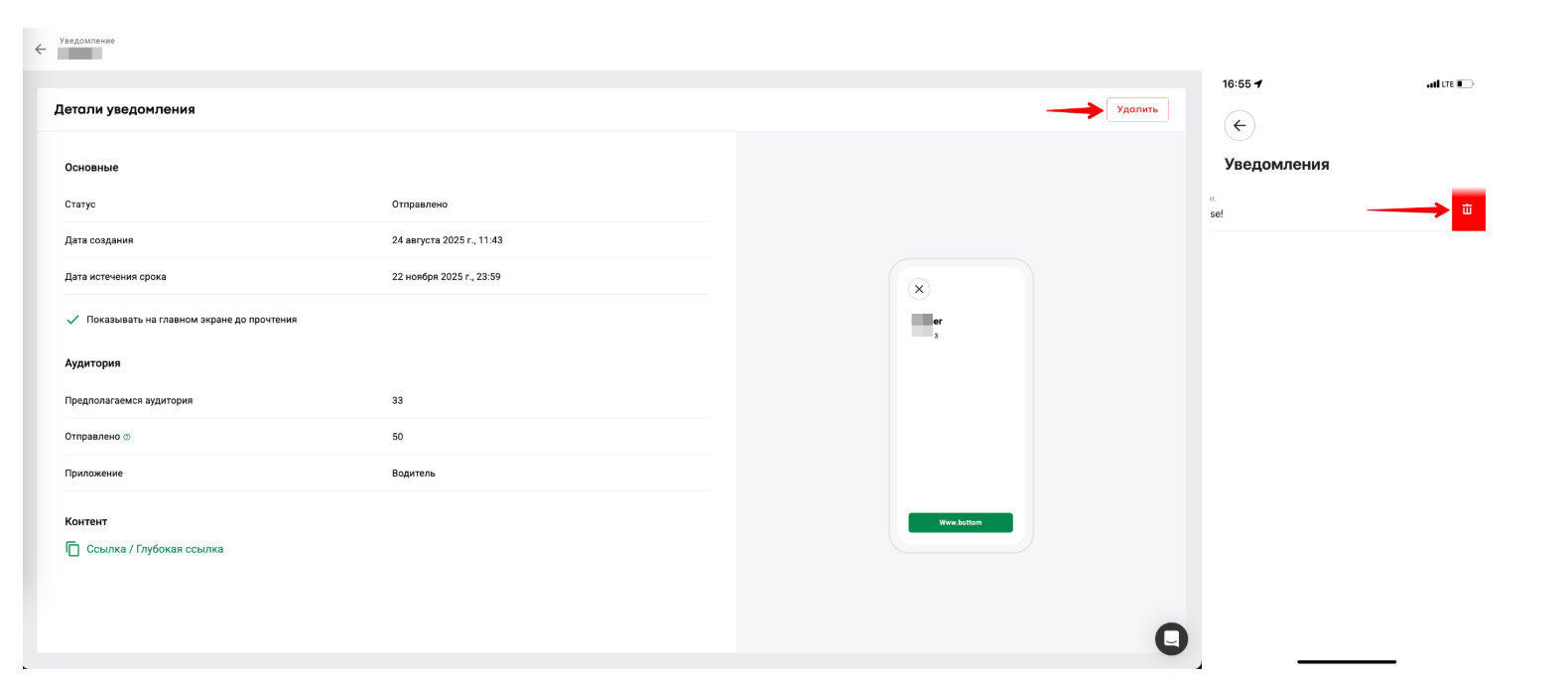 а) Пользователь может удалить уведомление в приложении. Для этого откройте “Уведомления” в боковом меню приложения и сдвиньте уведомление влево до упора, пока не появится значок корзины.