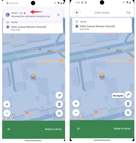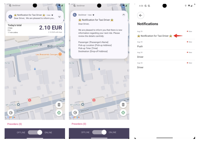 Если водитель/клиент с Android устройством имеет активный заказ и нажимает на всплывающее уведомление, он перенаправляется на экран заказа, а не во вкладку “Уведомления” бокового меню приложения.