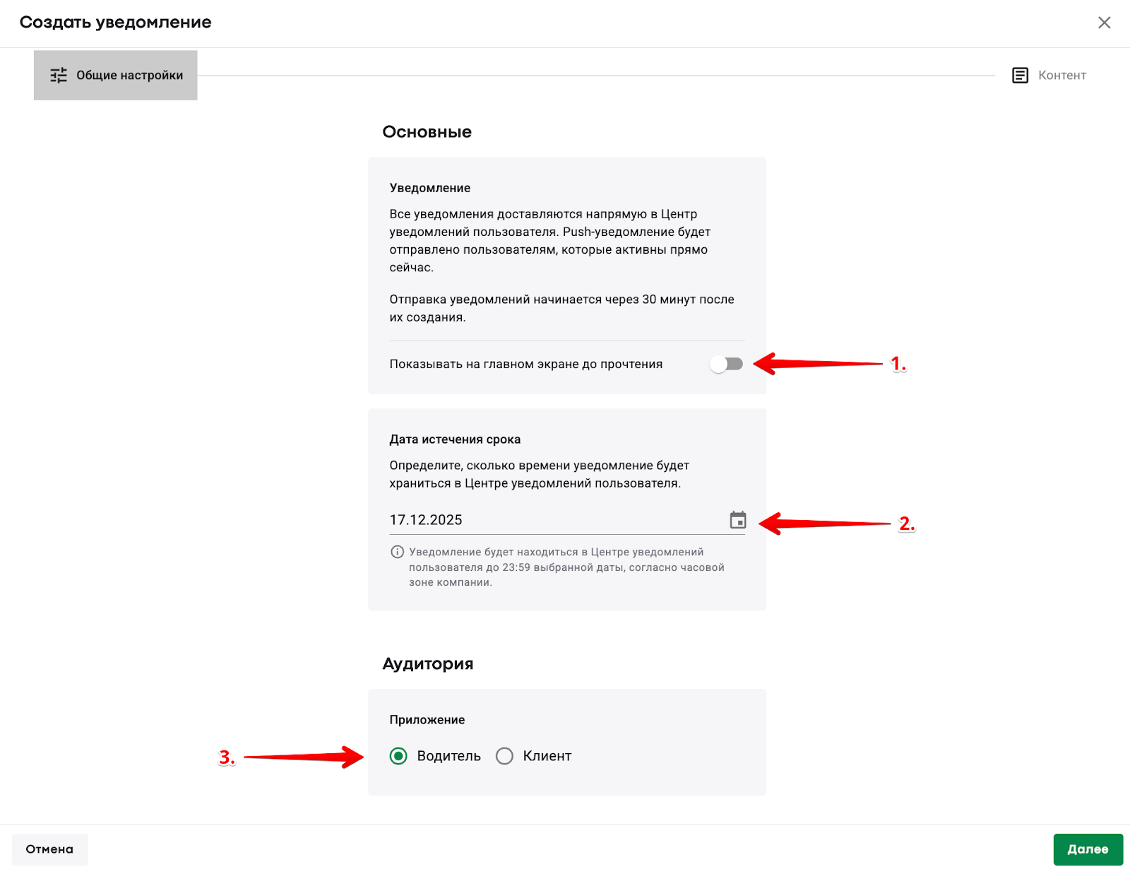 1) Включите опцию “Показывать на главном экране до прочтения”, если хотите сделать уведомление приоритетным. Приоритетное уведомление будет отображаться на главном экране приложения (первый экран, который пользователь видит, открыв приложение) и во вкладке “Уведомления”.