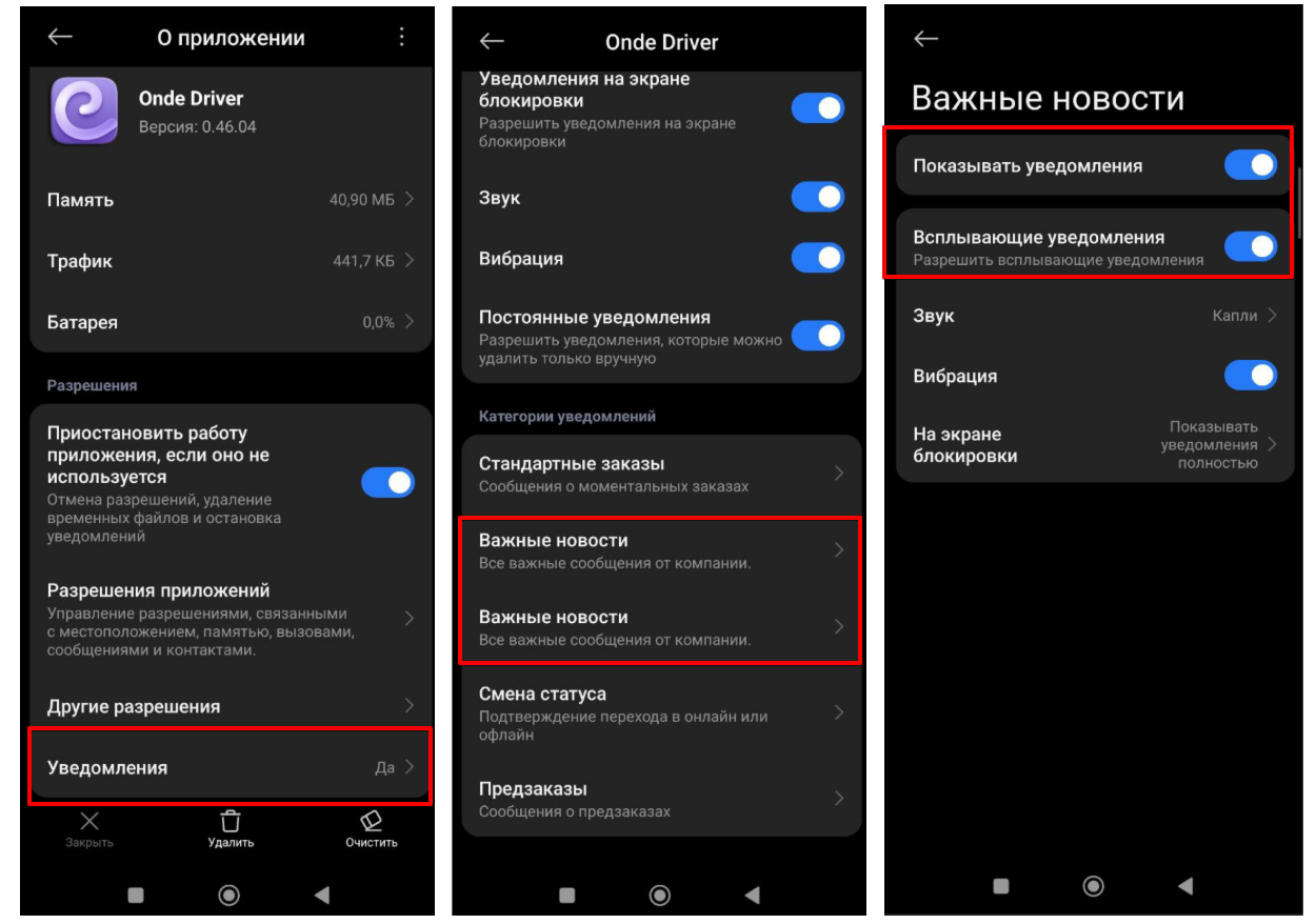 Настройки > Дополнительно > Диспетчер приложений > Driver App > включить “Показывать уведомления” > включить “Важная информация компании”.