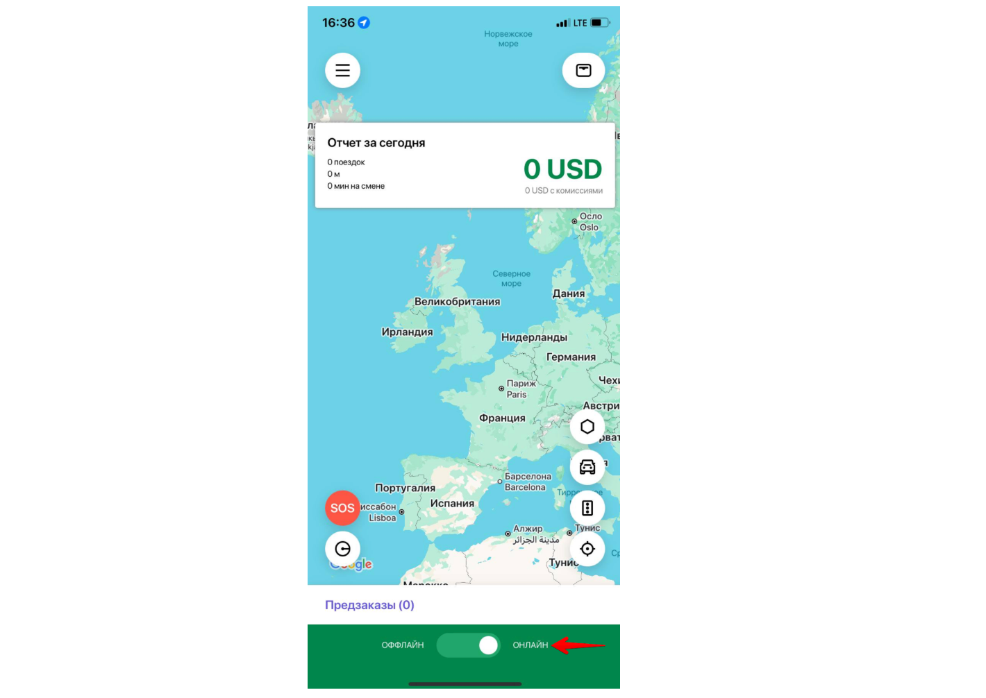 Когда водителю предлагается новый заказ, кнопка “онлайн-оффлайн” недоступна на главном экране приложения.