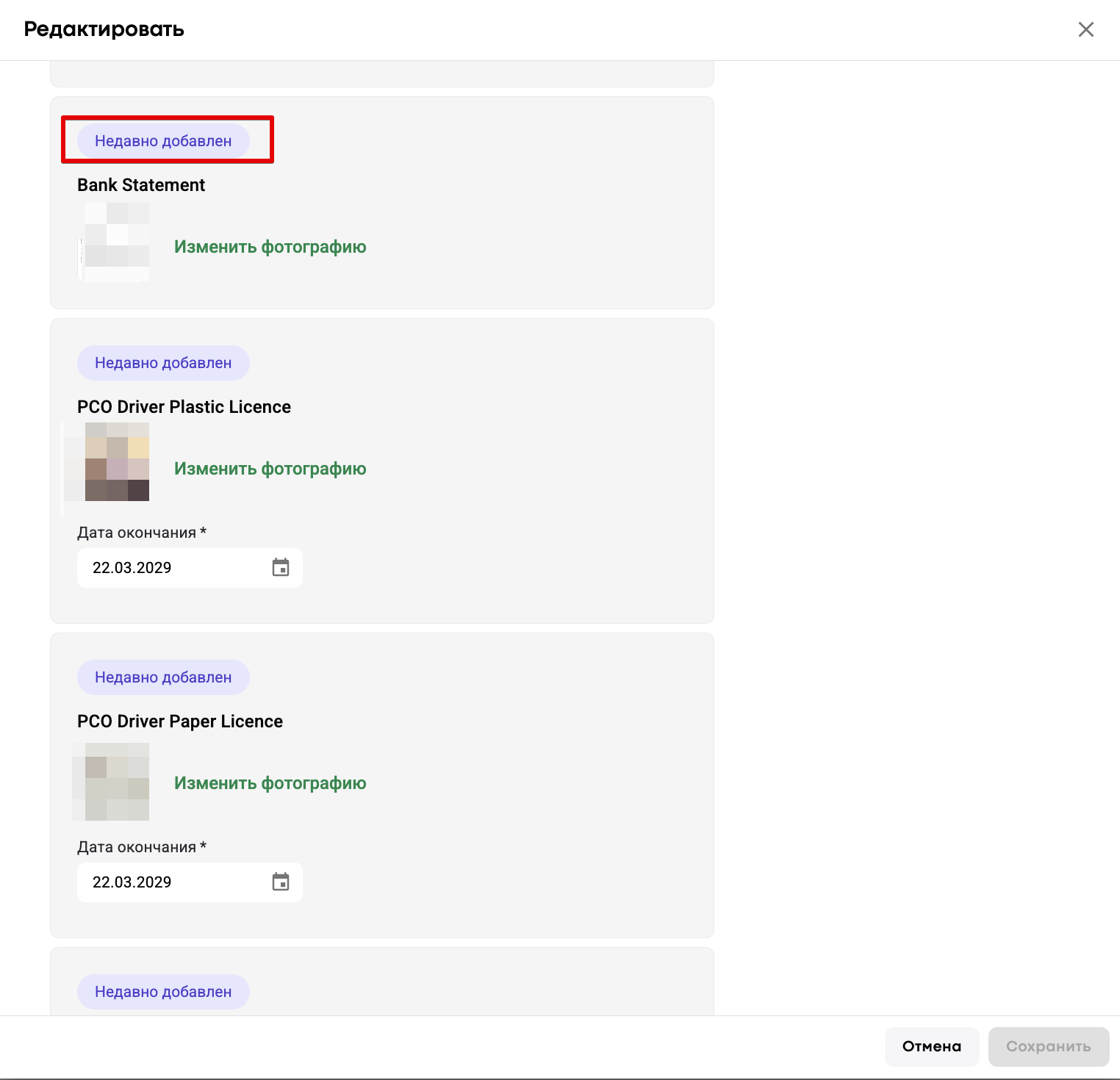 Все документы со сроком действия, которые водитель добавил в течение последних 14 дней, помечены в My hub как “Недавно добавлен”.