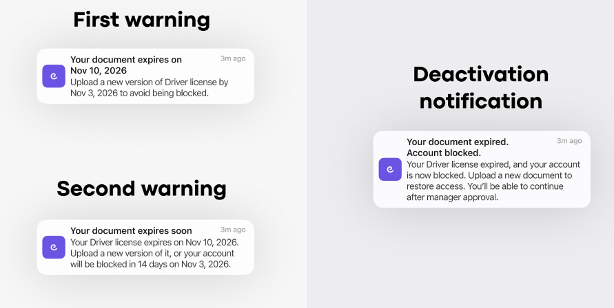 Просроченные документы удаляются из профиля водителя. Чтобы пройти повторную активацию, водитель должен обновить просроченные обязательные документы через свое приложение и повторно отправить профиль на рассмотрение.