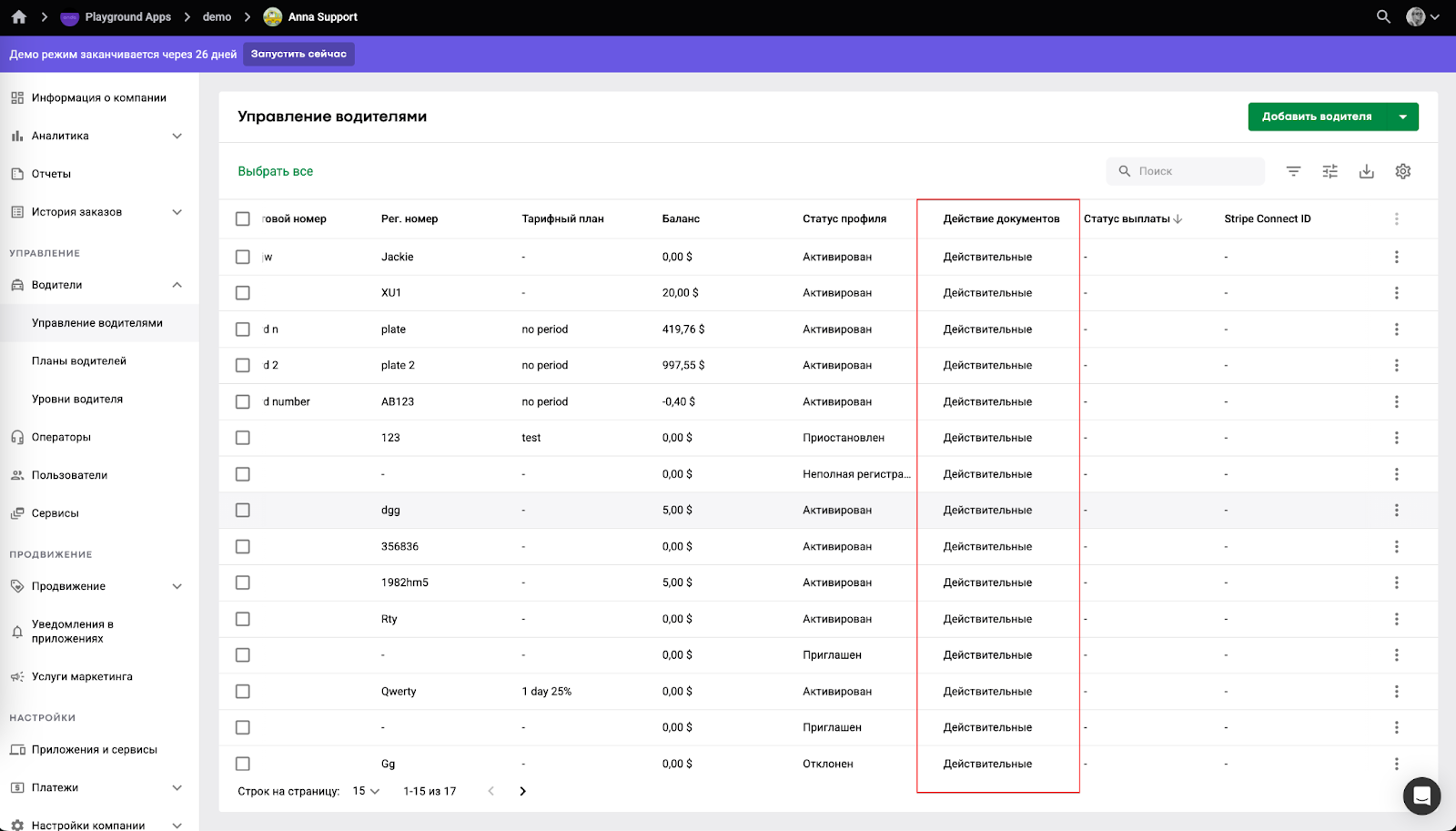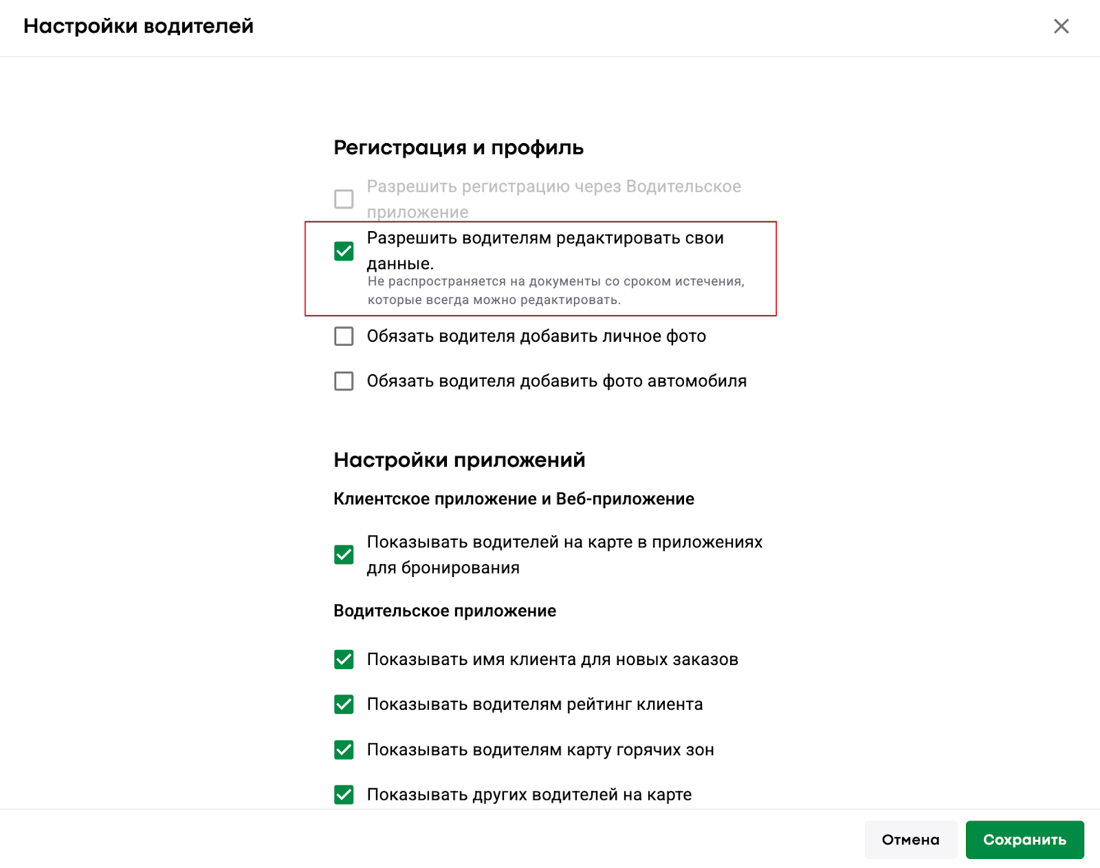 Учтите, что даже если в разделе “Настройки водителей” опция “Разрешить водителям редактировать свои данные” отключена, водители все равно смогут редактировать или заново добавлять документы со сроком действия.