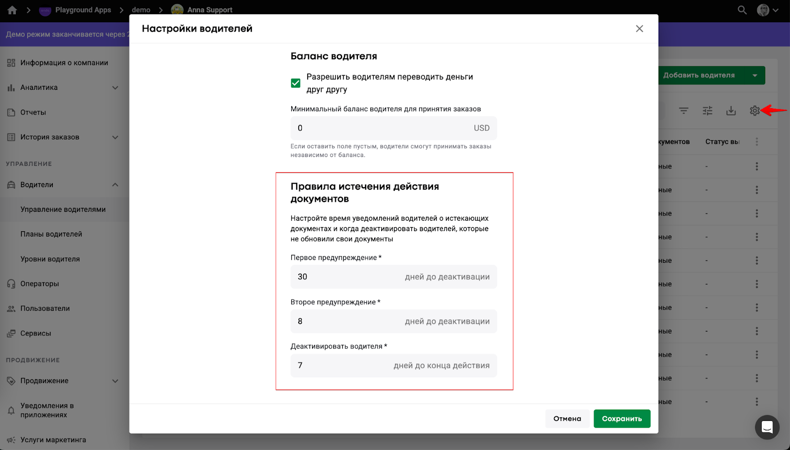 В “Правилах истечения действия документов” компания может указать, за сколько дней до истечения действия документа водитель будет получать push-уведомления: